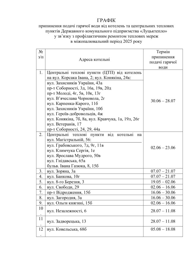 ДКП «Луцьктепло» зобов’язане дотримуватися графіка при умові надання послуги з централізованого постачання гарячої води в міжопалювальний період 2025 року.