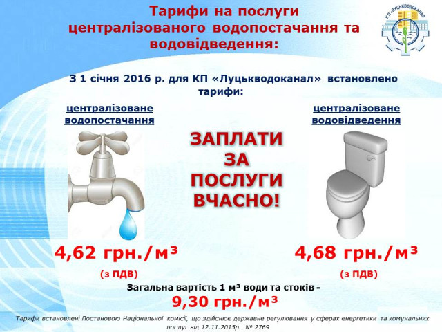 Нагадаємо, з 1 січня 2016 року у Луцьку набули чинності скориговані тарифи на послуги з централізованого водопостачання та водовідведення, затверджені Постановою Національної комісії, що здійснює державне регулювання у сферах енергетики та комунальних послуг (НКРЕКП) від 12.11.2015 р. № 2769.