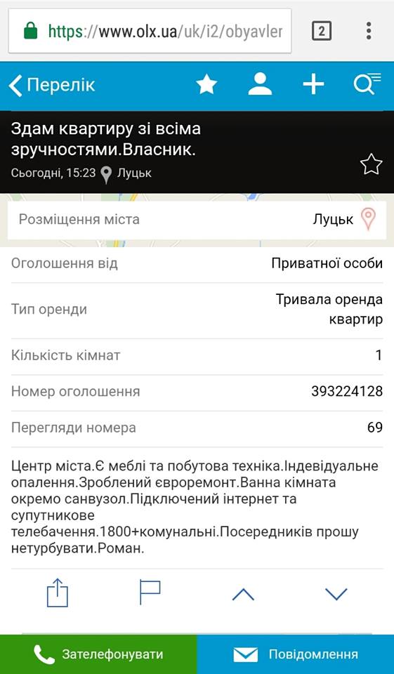 З її слів, оголошення знайшла на сервісі OLX. Йшлося про квартиру в центрі міста, біля ЦУМу, за невелику оплату – 1800 гривень плюс комунальні послуги.