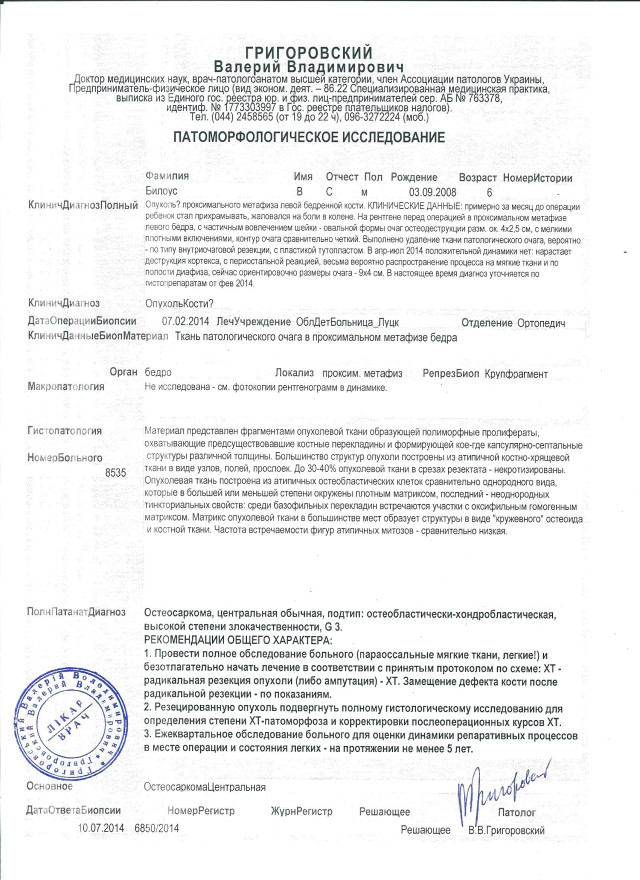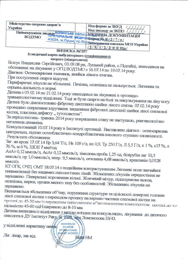 Маленький хлопчик Владик Білоус потребує допомоги. Дитині 6 років, і вона бореться зі страшною хворобою – у Владика остеосаркома шийки лівої стегнової кістки. Владик зараз в Угорщині і потребує дороговартісного лікування та 2 операції.
