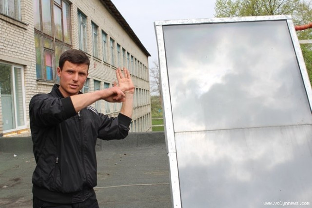 «Такий колектор може зробити кожен, - розповідає майстер Віталій Шрамко. Окрім цієї школи, подібні установки ми виготовили для дитячого садочка у Маневичах, нещодавно для Стрийського аграрного коледжу, а лише півтора роки тому я змайстрував свій перший сонячний колектор батькам у приватну садибу. Взимку він може нагрівати воду до 40 градусів у сонячний день, а в теплу пору року ми взагалі не витрачаємо електроенергію для нагріву води».