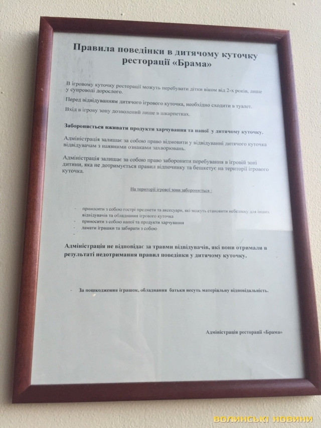 Нагадаємо, минулих вихідних у луцькій ресторації «Брама», що по проспекту Соборності, травмувався 6-річний хлопчик. На дитину впав іграшковий будиночок і з пальця пішла кров. Разом з хлопчиком в закладі була 20-річна старша сестра та вагітна тітка. А адміністрація почала вимагати відшкодування збитків.
