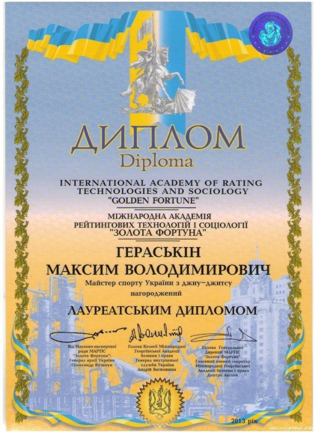 Чемпіона Європи, майстра спорту України з джиу-джитсу Максима Гераськіна нагородили Лауреатським дипломом Міжнародної академії рейтингових технологій і соціології «Золота Фортуна» за значні спортивні досягнення. Максим навчається в Луцькому інституті розвитку людини Університету «Україна».