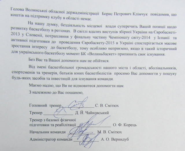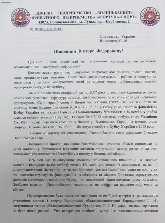 Керівництво команди «Волиньбаскет» не втрачає надію на порятунок команди і вдалося до відчайдушного кроку – відкритого листа Президентові України. Можливо після нього в команди таки з’являться прихильники, котрі захочуть і зможуть підтримати клуб і весь волинський баскетбол.