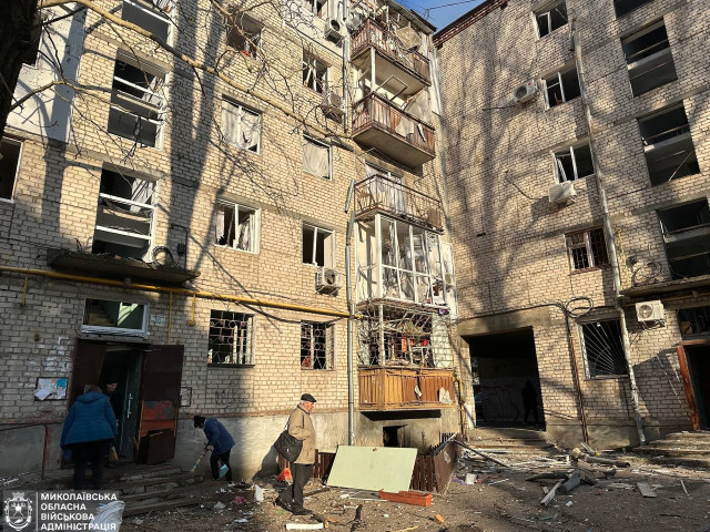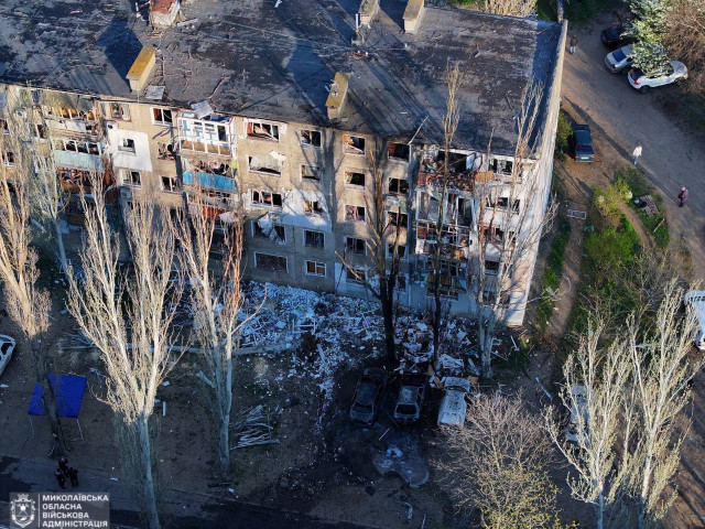 У ніч на 10 квітня росіяни атакували Миколаїв «Шахедами». Унаслідок падіння уламків збитих російських ударних безпілотників 10 людей дістали поранення, у місті пошкоджено житлові багатоповерхівки, адмінбудівлю, десятки гаражів та авто.