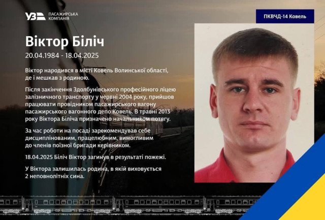 На Сумщині через пожежу у потязі загинув залізничник з Волині начальник поїзда пасажирського вагонного депо Ковель Біліч Віктор Володимирович.