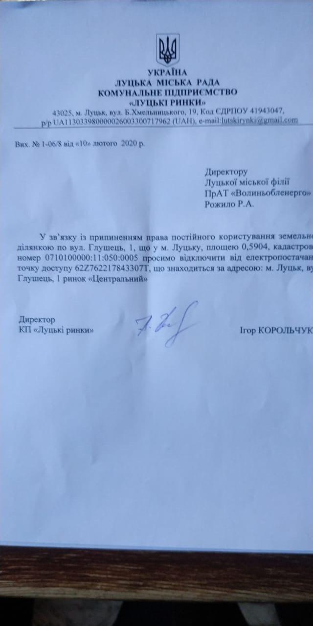 Як значиться у заяві, електропостачання просять припинити у зв’язку із припиненням права постійного користування ділянкою на вулиці Глушець, 1 в Луцьку.