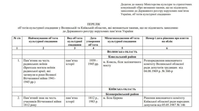За поданням департаменту культури, молоді та спорту Волинської ОДА, враховуючи лист Ковельської міської ради та рекомендації Українського інституту національної пам’яті, Міністерство культури та інформаційної політики видало наказ про виключення з реєстру ще одного об’єкта культурної спадщини.
