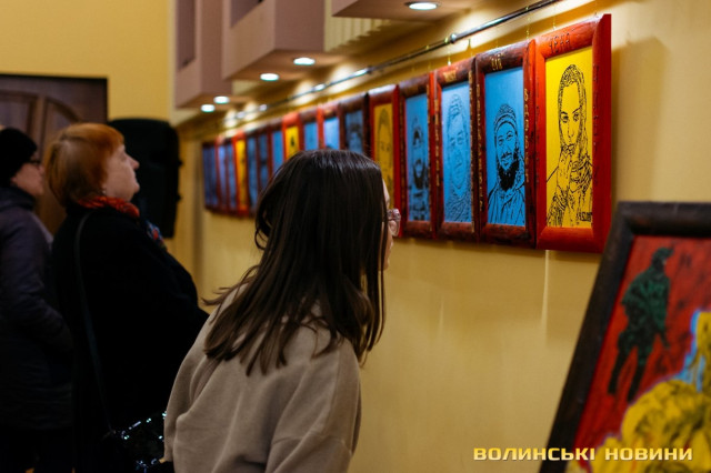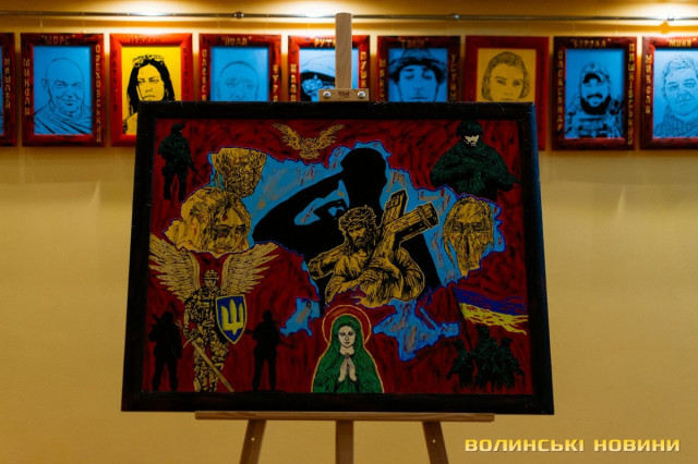 «Ніколи не вмів малювати, не любив малювати, – зізнається Руслан. – Пензля мені в руки вклав Бог, коли я після восьми місяців мовчання – наслідок контузії – почав відновлюватися».Справді, шлях воїна до усвідомлення власного покликання був надзвичайно складним і болісним. Він – учасник Майдану, солдат АТО/ООС знову пішов воювати у 2022 році. У складі батальйону «Айдар» побував на найважчих ділянках фронту, був поранений, мав важку контузію… Віра в Бога і мистецтво, як зізнається, не лише повернула мову, але й дає сили жити, зцілює, надихає допомагати іншим. А ще прийшло усвідомленням власної місії – зробити все, аби про цю війну не забули.«Я тоді довго мовчав – після 2014. Вісім місяців. Потім якісь звуки почав видавати і пробувати малювати. Вчився щось потрохи… В мене все прив’язане до сакрального – духовне, військове, історія. А перші портрети почав малювати, бо в мене був страх, що історія знову зміниться і все це забудеться. Так вже було. Я знаю, як все забувається і переписується – малим читав із захопленням про «подвиги» партизанів, які боролися з бандерівцями. А вже потім почав дізнаватися, як все було насправді», – розповідає Руслан Кашаюк.З того часу художник створив дуже багато зображень. На одних – миті війни, інші – сповнені релігійного сенсу. Окремо вирізняється серія портретів побратимів – живих і померлих. Ці своєрідні ікони пам’яті, які з іменами-прізвищами та позивними, і представлено на виставці. А ще суголосне зображення Страстей Христових – шляху Спасителя на Голгофу, як мучеництва заради порятунку інших.Читати ще: Молилися на колінах: на стінах волинського храму розвісили портрети Героїв, які намалював військовий