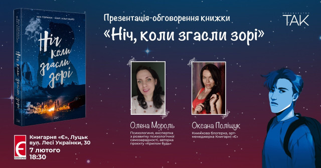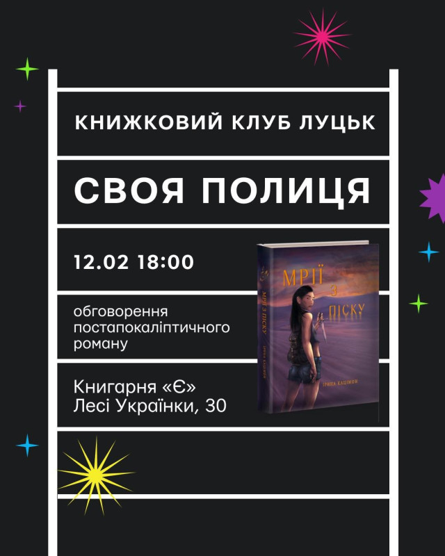 Вистава театру «Чорний квардат» під назвою «Уроки сексу від А до Я» в театрі ляльок | 6 лютогоДрама-інтерв’ю «Долі жіночі, або Послання від заробітчанок» у драмтеатрі імені Тараса Шевченка | 7 лютогоКнижкова презентація «Ніч, коли згасли зорі» в книгарні «Є» | 7 лютогоВистава «Лісовий цирк» у театрі ляльок | 8 лютогоКомедія «Сватання на Гончарівці» у драмтеатрі імені Тараса Шевченка | 8 лютогоАвторський концерт композитора Костянтина Яворського «Сни» в театрі ляльок | 8 лютогоРіздвяна казка «Піколетто» у драмтеатрі імені Тараса Шевченка | 8 лютогоІІ відкритий чемпіонат міста з волейболу в ОДЮСШ | 8 лютогоКитайський новий рік у РЦ «Промінь» | 8 лютогоТренінг «ІНША» від ФРІ Луцьк | 8-9 лютогоМузична комедія «Різдвяна ніч» у драмтеатрі імені Тараса Шевченка | 9 лютогоВистава «Пригоди принца та принцеси» в театрі ляльок | 9 лютогоВистава «Казковий день Лілеї» у драмтеатрі імені Тараса Шевченка | 9 лютогоІмерсивна виставка луцького фотографа-військового Віктора Голікова «Портал Зерна» в центрі «Або Або» | 9 лютогоТренінг «Тіло в тонусі: як забезпечити фізичне здоров'я та гармонію». Реєстрація | 9 лютогоЧорна комедія «Той, що відчиняє двері» у драмтеатрі імені Тараса Шевченка | 11 лютогоВистава «Основний інстинкт» у драмтеатрі імені Тараса Шевченка | 11 лютогоЗустріч книжкового клубу в книгарні «Є» | 12 лютогоМузичний проєкт «Неосяжний світ музики» в музичній школі №1 | 12 лютогоДрама «Не шукайте щастя, бо я його украв» у драмтеатрі імені Тараса Шевченка | 13 лютого«Медіастійкість: безпека в епоху штучного інтелекту». Реєстрація тут | 13 лютого