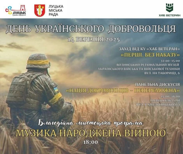 Kalush Orchestra в РЦ «Промінь» | 13 березняЗаходи у Волинському музеї українського війська та військової техніки | 14 березняБлагодійна мистецька програма «Музика народжена війною» в Палаці культури | 14 березняМузичний лекторій у музичній школі №1 | 14 березняВідкриття виставки «Горизонт сингулярності» художника Василя Бедея в Музеї Корсаків | 14 березняВідкриття виставки авторських ляльок від українських майстринь «Від князівен до захисниць» у культурно-мистецькому центрі «Красне» | 14 березняВідкриття виставки в облраді | 14 березняВистава «Снігова королева» в театрі ляльок | 15 березня«Minecraft в реальному житті». Інтерактивна, музично-розважальна вистава для всієї родини в Палаці культури | 15 березняТренінг з основ волонтерства для молоді. Реєстрація тут | 15 березняТренінговий семінар «Тайм-менеджмент у проєктах: як усе встигати» в публічній бібліотеці | 15 березняЗустріч з письменницею Марі Морт і презентацію її темного фентезі «Кістяна Вежа» в книгарні «Є» | 15 березняВистава «Сонечко і снігові чоловічки» в театрі ляльок | 16 березняКонцерт «Український квінтет» в Палаці культури | 16 березняГра «Без меж». Реєстрація тут | 16 березняChico & Qatoshi в РЦ «Промінь» | 16 березняАндрій Кравченко в РЦ «Промінь» | 19 березняVIRSKY у драмтеатрі імені Тараса Шевченка | 19 березняЗахід у misto.cafe.lutsk | 19 березняЛекція «Секрети ефективного тайм-менеджменту» в центрі Дія.Бізнес | 19 березняПрактикум «Інструменти штучного інтелекту для бізнесу та особистої ефективності» в Бізнес-академії РМВА | 20 березня