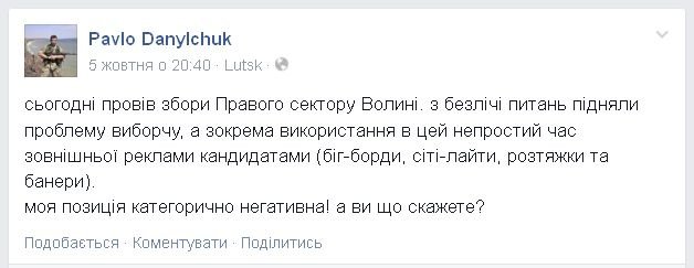 Нещодавно лідер волинського Правого сектору Павло Данильчук у мережі Facebook задався питанням: чи варто зараз політикам використовувати зовнішню рекламу? «Моя позиція категорично негативна!» - резюмував громадський активіст.
