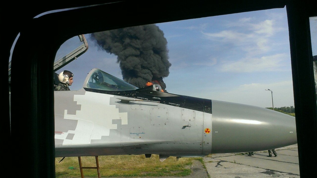 Один з льотчиків 40-ої бригади тактичної авіації, яка дислокується на військовому аеродромі у Василькові Київської області, в кабіні легкого фронтового винищувача МіГ-29 в очікуванні наказу на евакуацію з аеродрому через пожежу на прилеглій до аеродрому нафтобазі