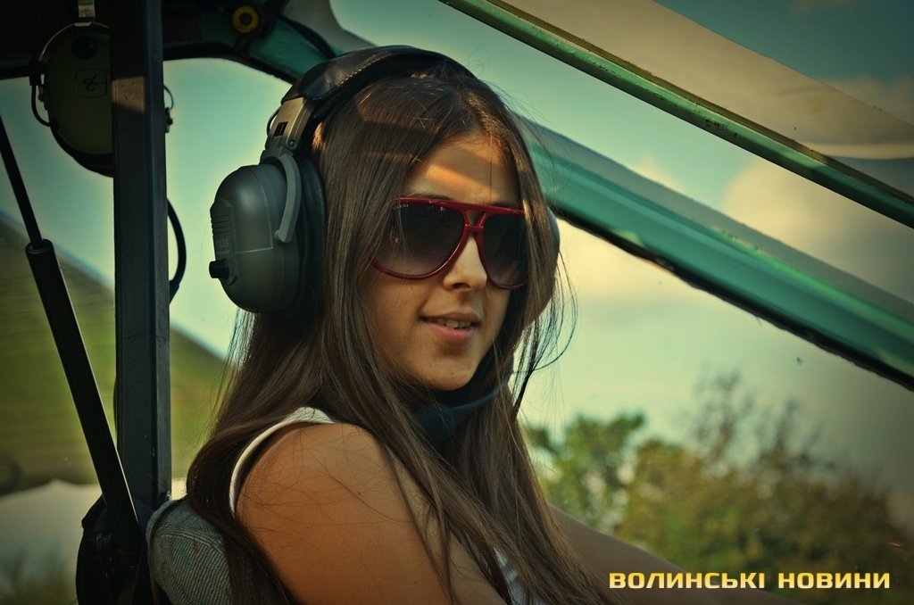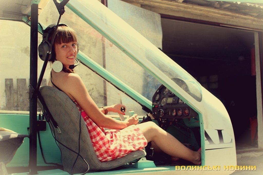 Репортер ІА Волинські Новини Вікторія Семенюк в кабіні літака власної конструкції Луцького Аероклубу «Крила Волині»
