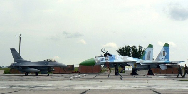 Американський винищувач F-16 «Fighting Falcon» та український винищувач Су-27 на військовому аеродромі в Миргороді Полтавської області під час військових навчань «Безпечне небо – 2011»