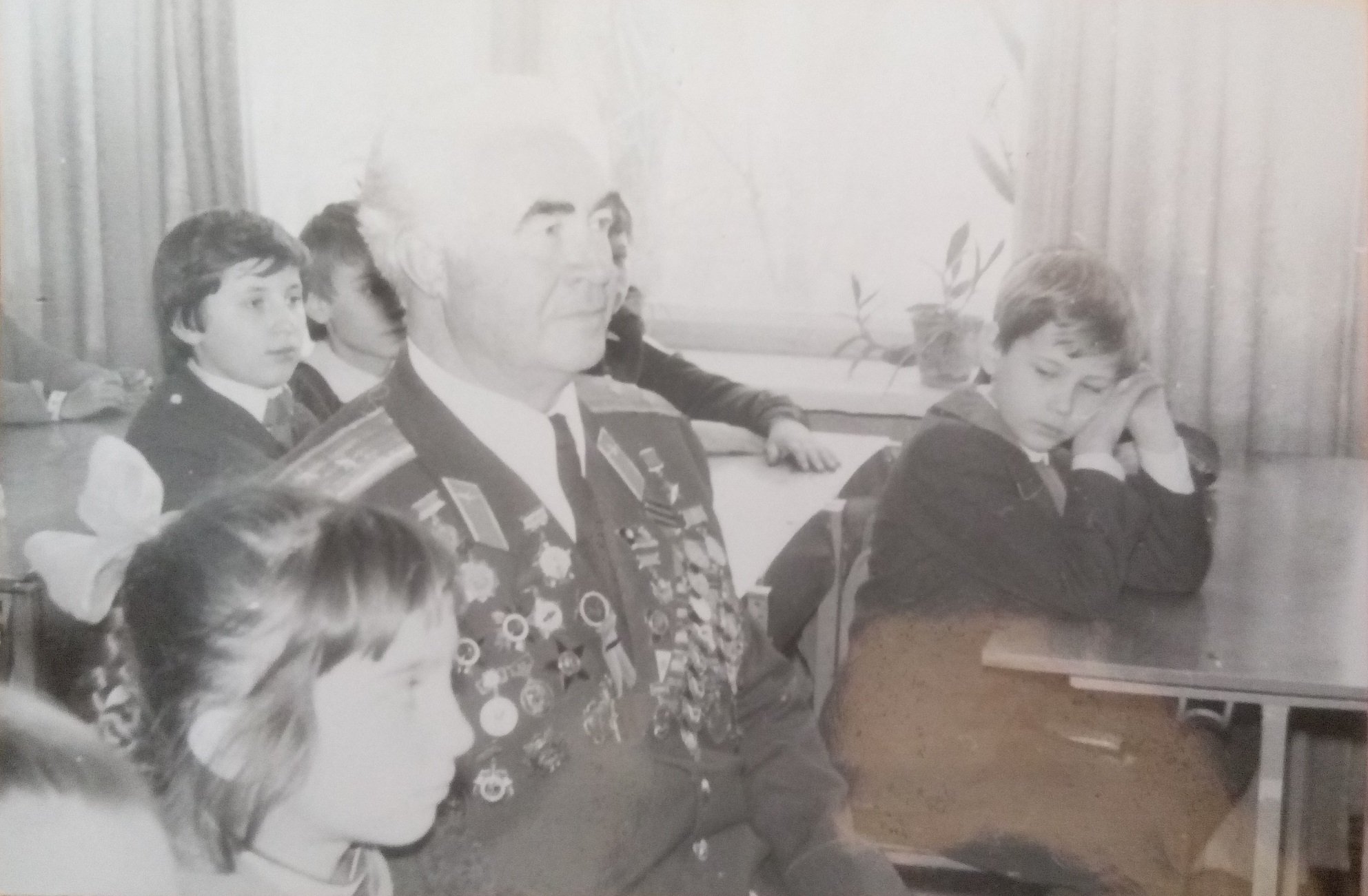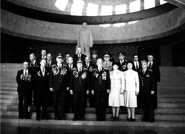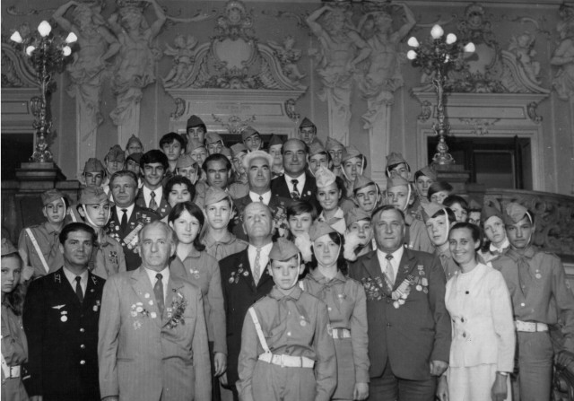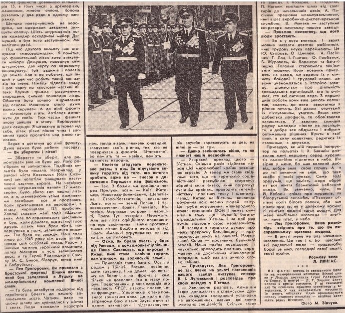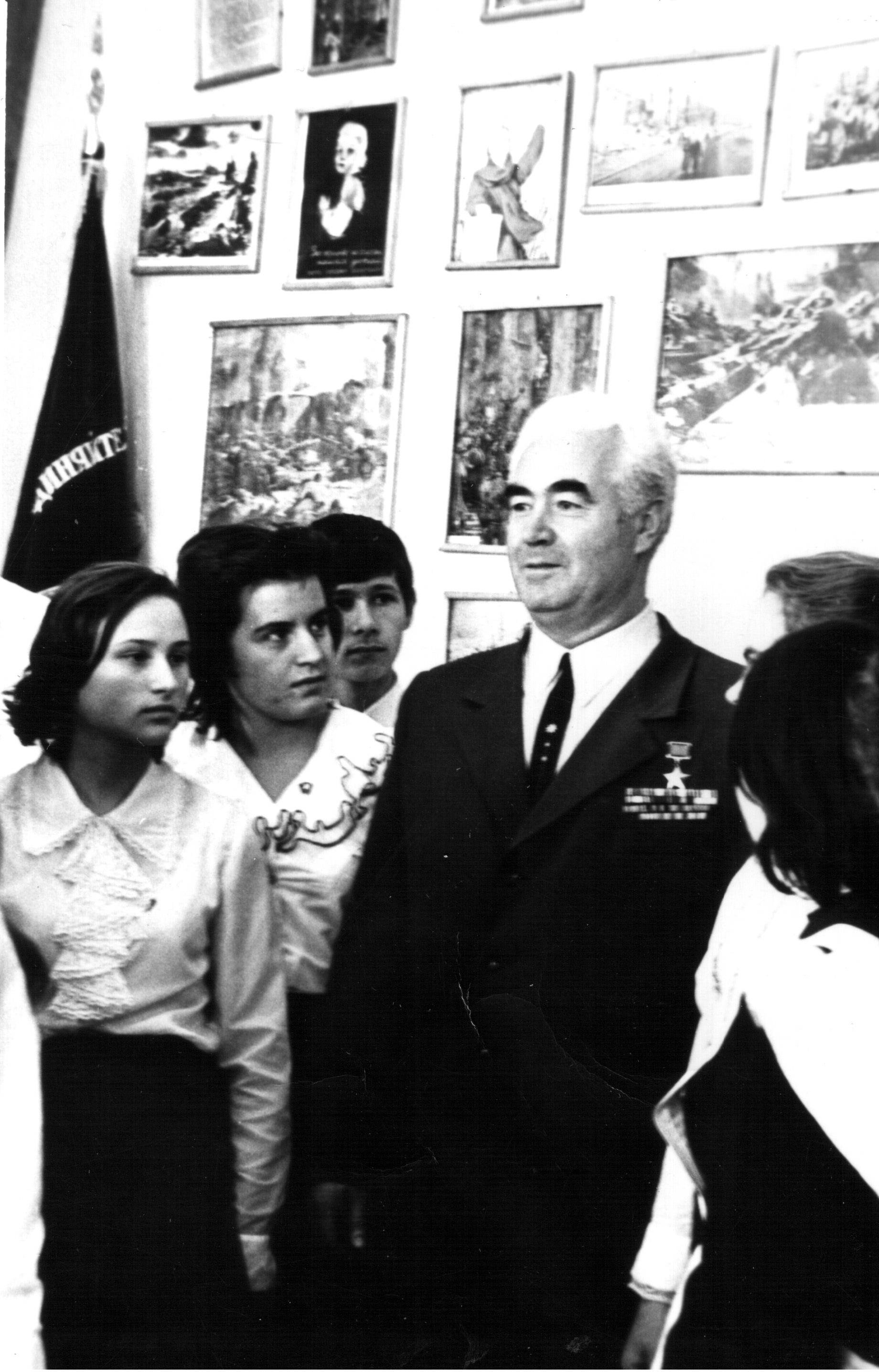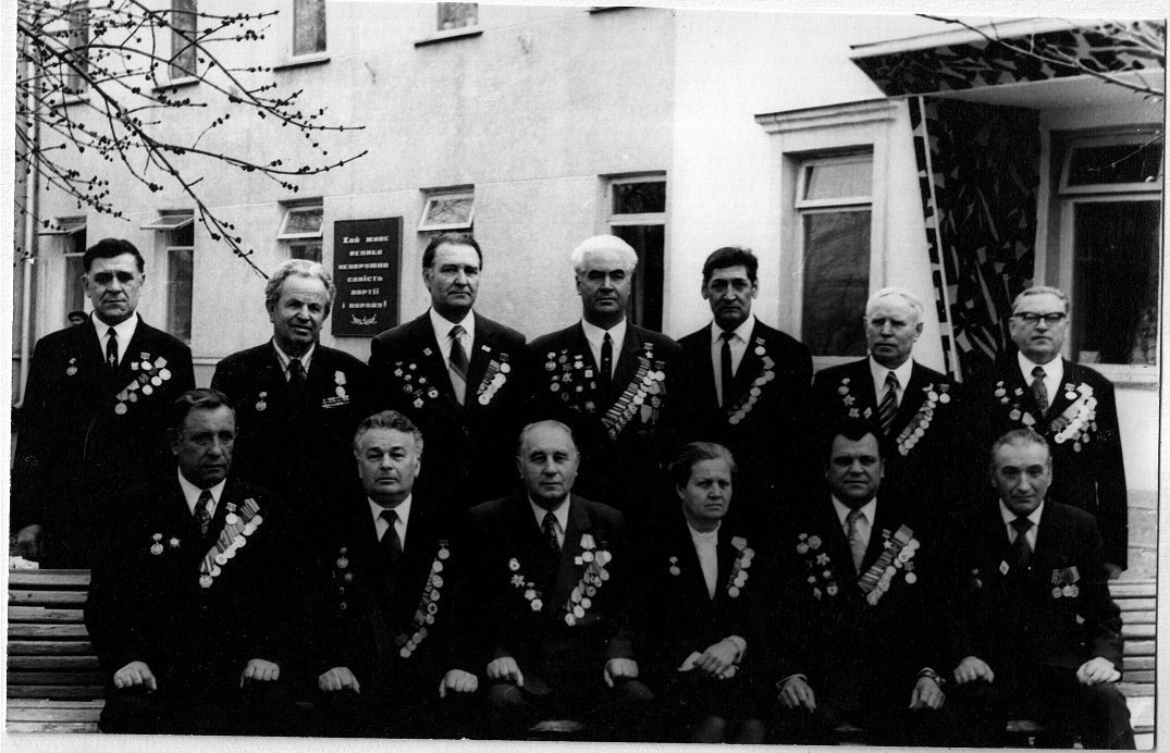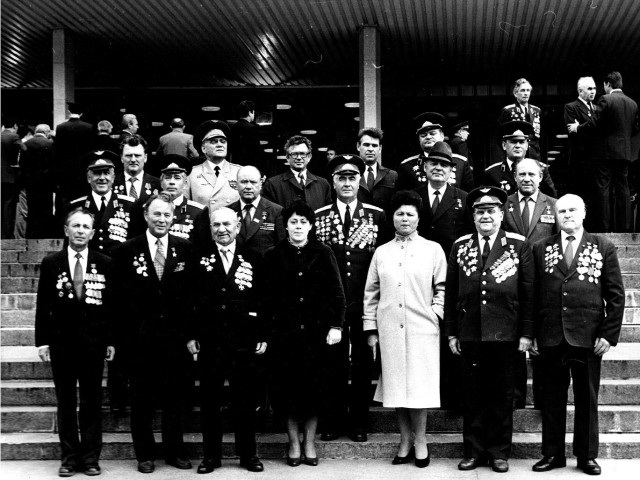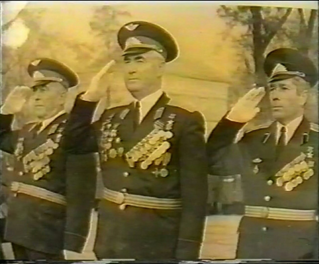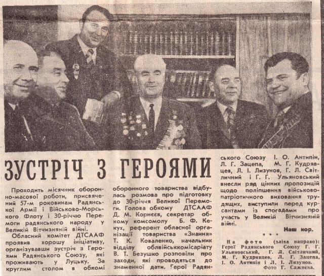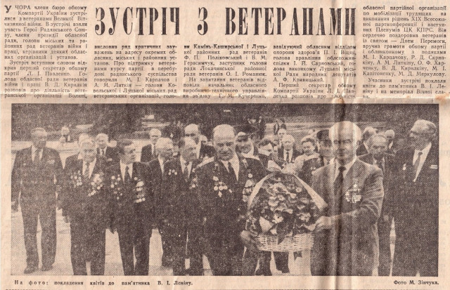 Почесні громадяни Луцька, Герої Радянського Союзу Лев Григорович Зацепа (справа) і Микола Гаврилович Кудрявцев на зустрічі з учнями Луцької загальноосвітньої школи № 9. 9-те травня 1984 року