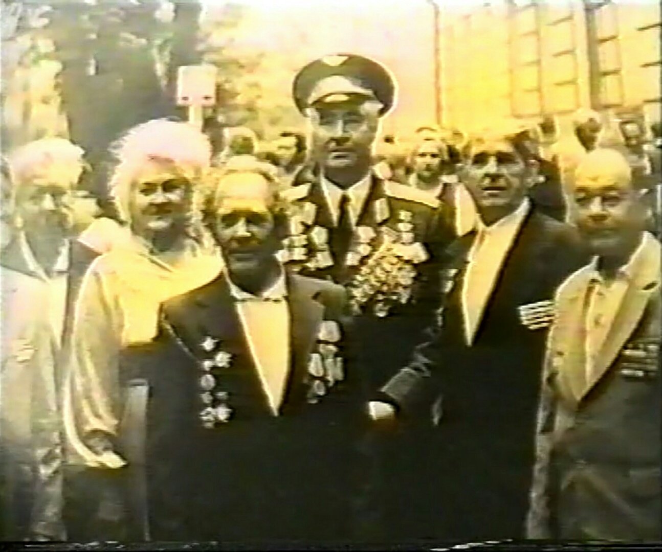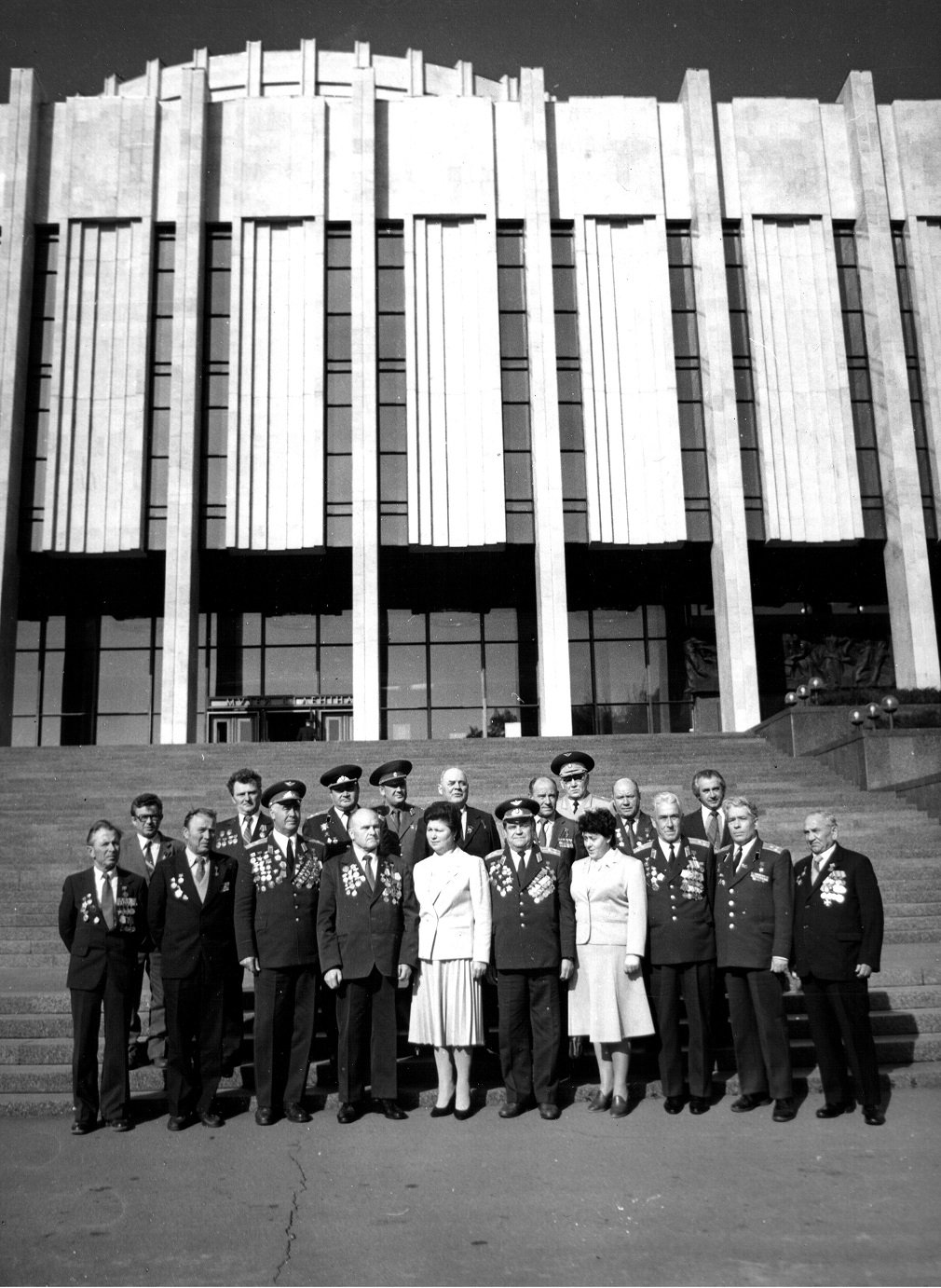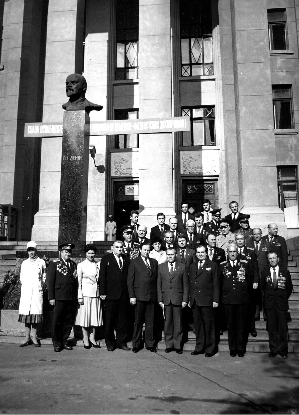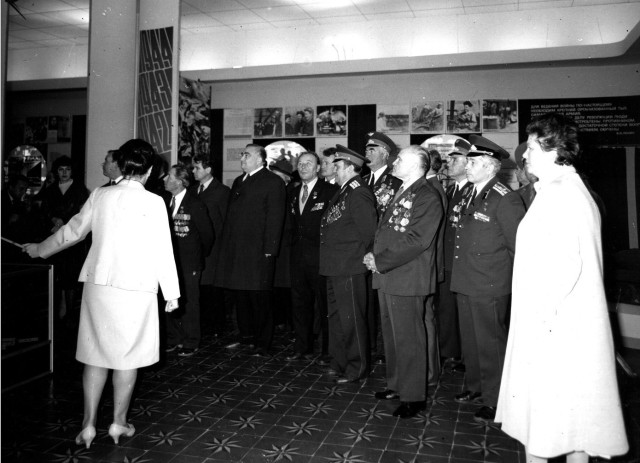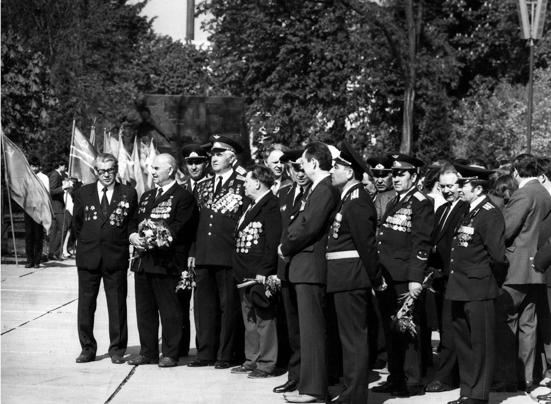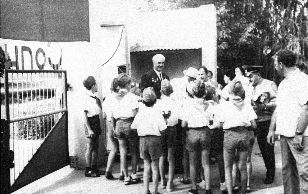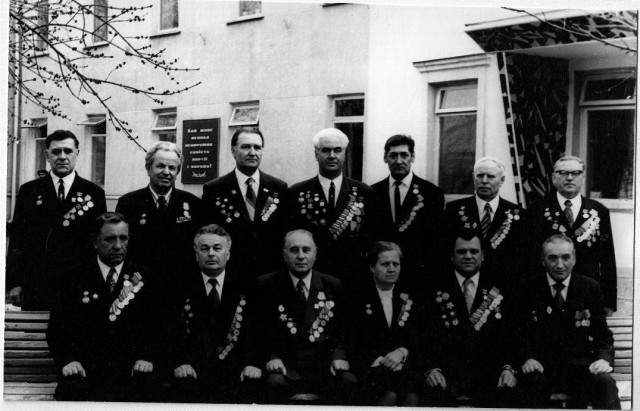 Почесні громадяни Луцька, Герої Радянського Союзу Лев Григорович Зацепа (справа) і Микола Гаврилович Кудрявцев на зустрічі з учнями Луцької загальноосвітньої школи № 9. 9-те травня 1984 року