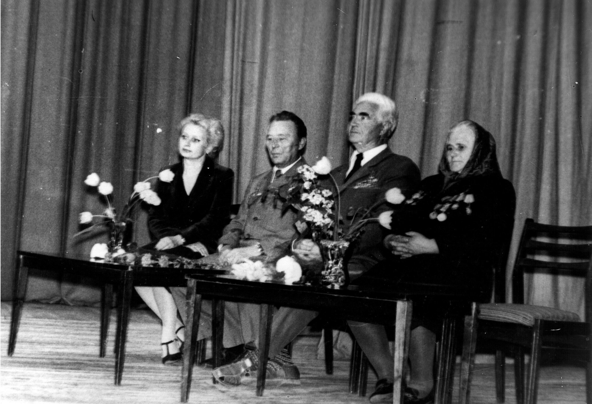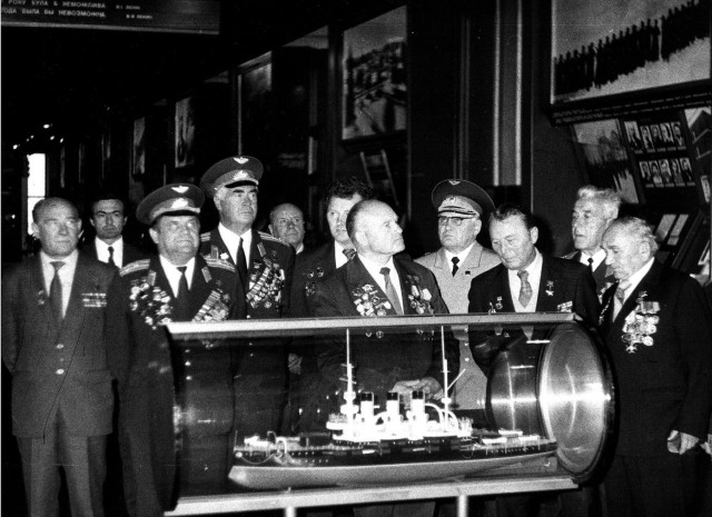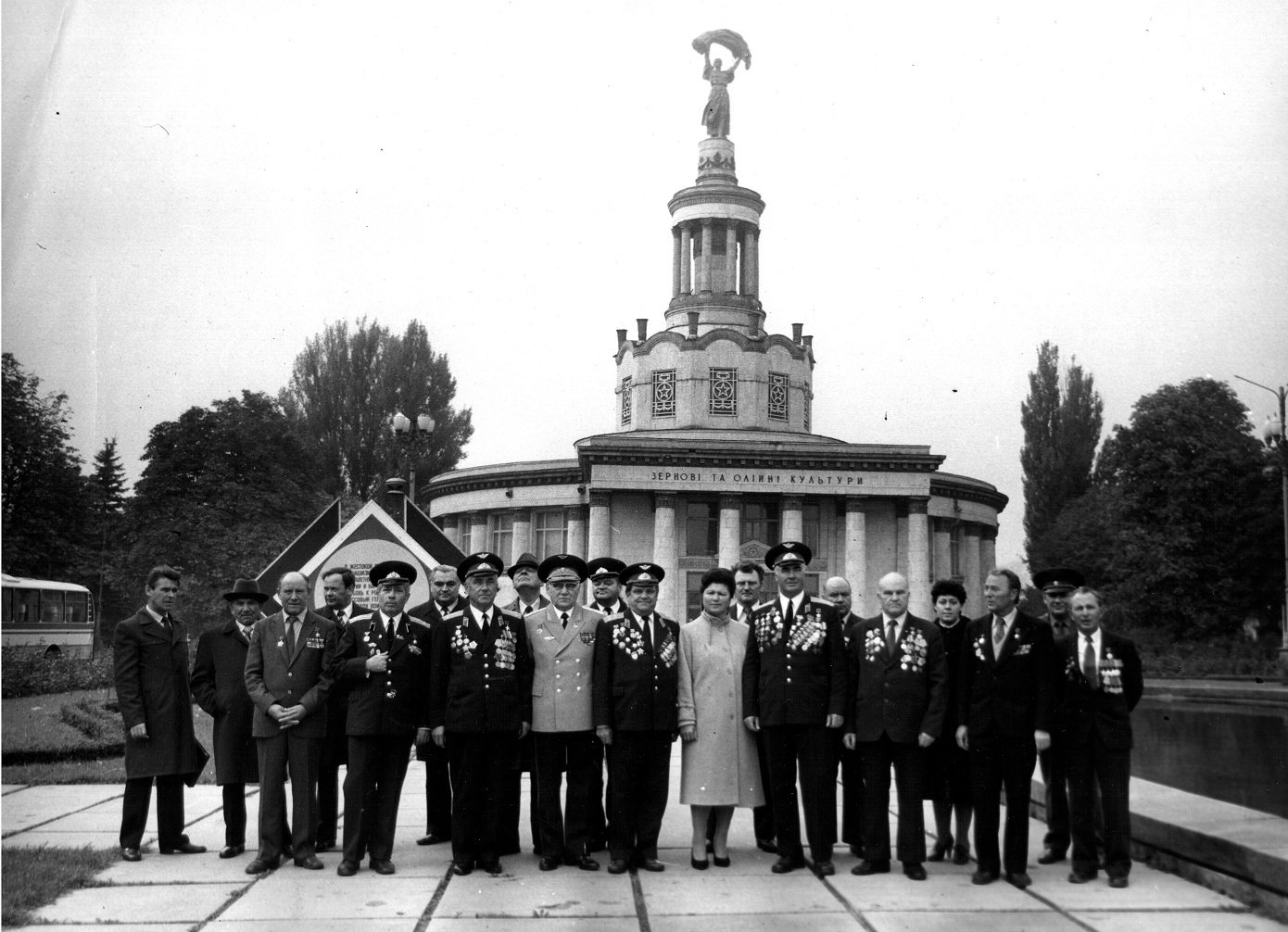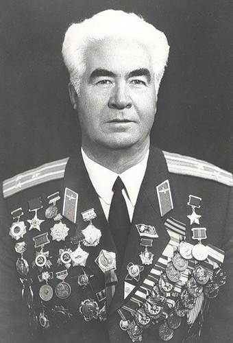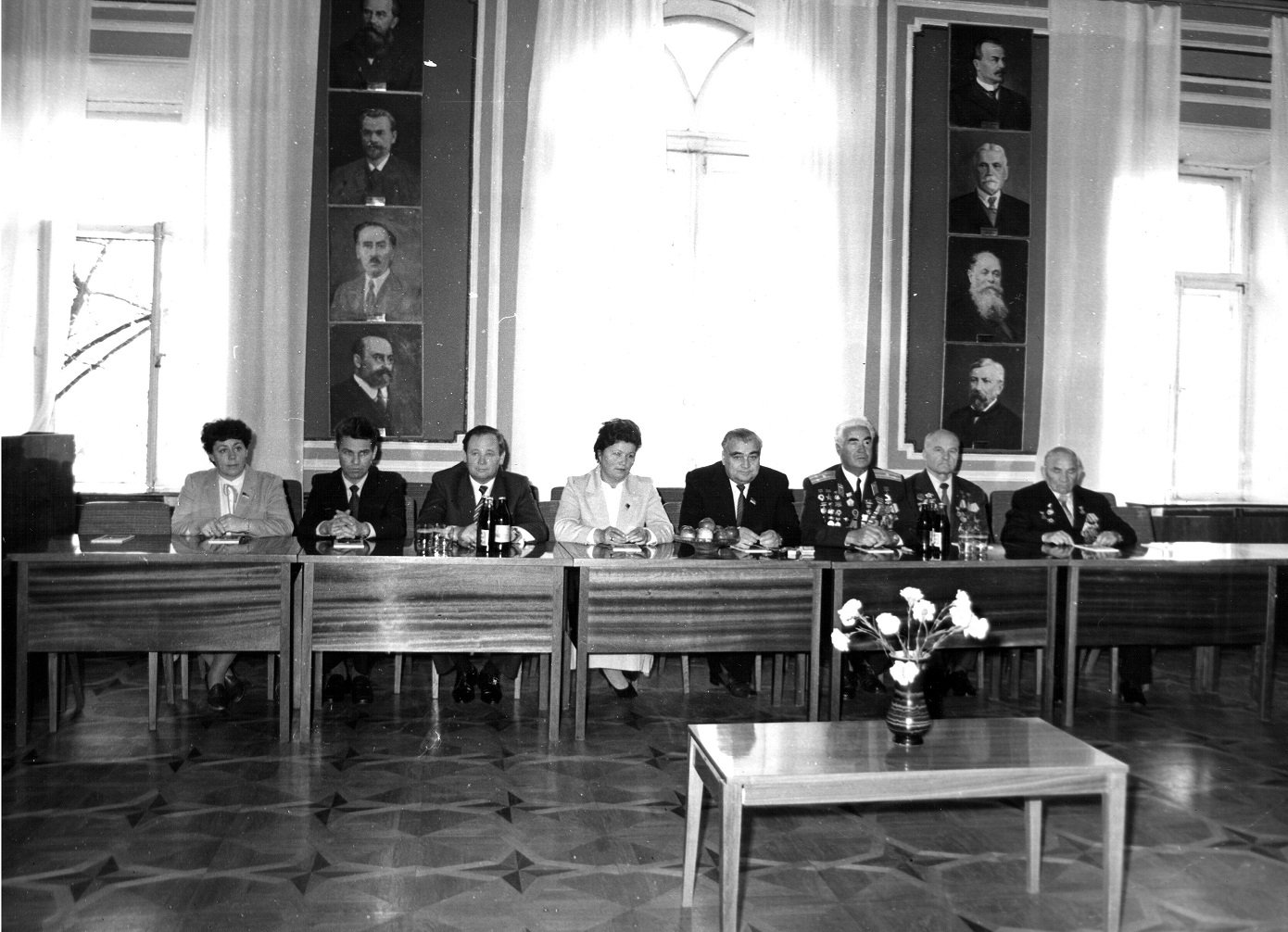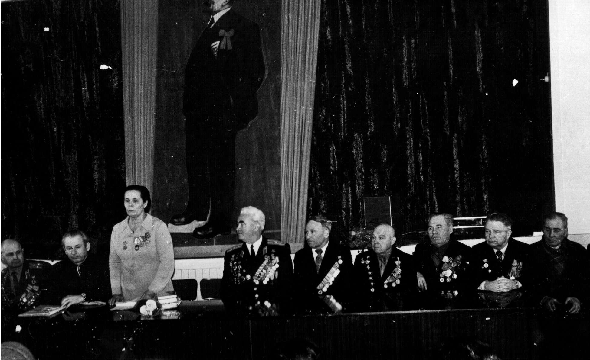 Почесні громадяни Луцька, Герої Радянського Союзу Лев Григорович Зацепа (справа) і Микола Гаврилович Кудрявцев на зустрічі з учнями Луцької загальноосвітньої школи № 9. 9-те травня 1984 року