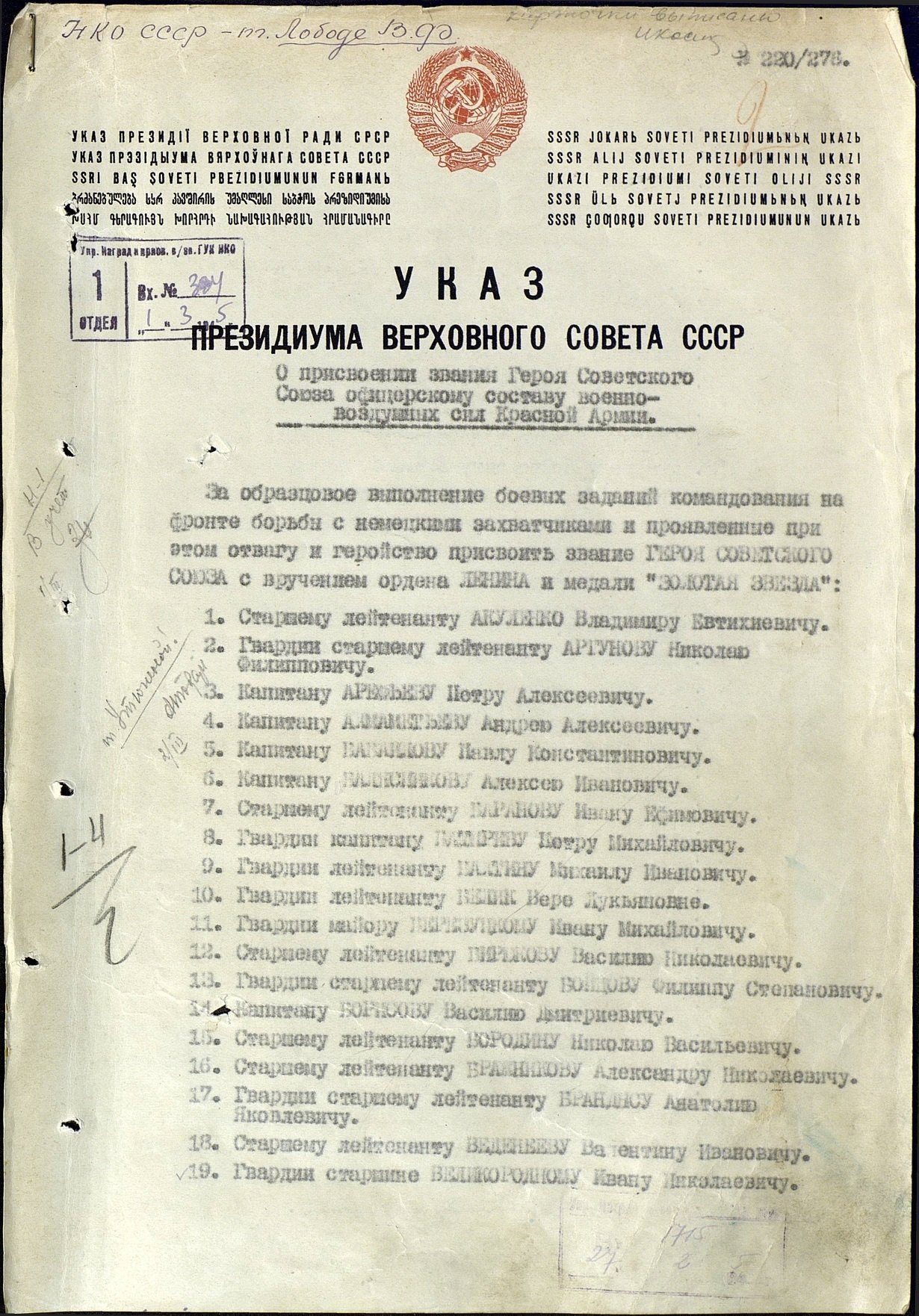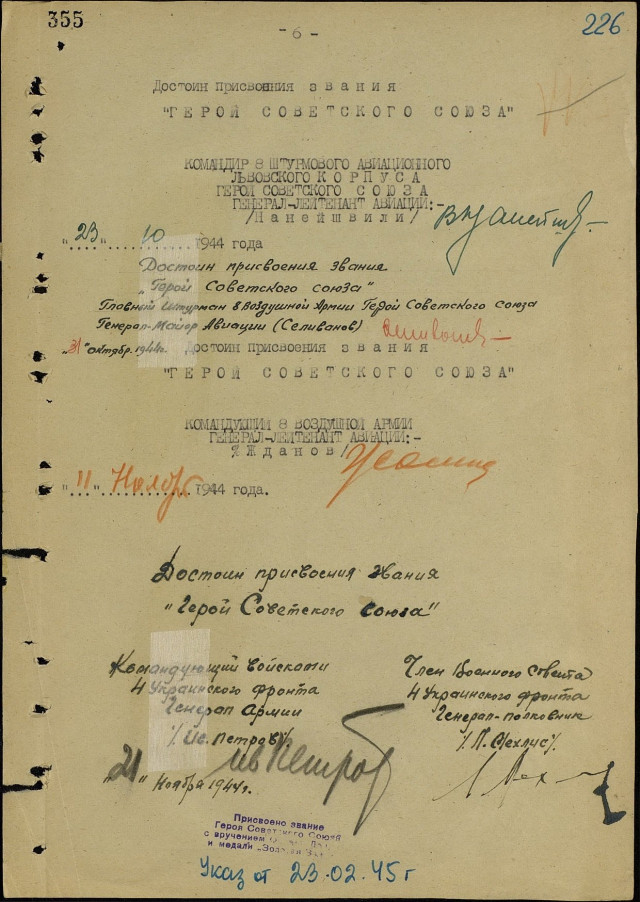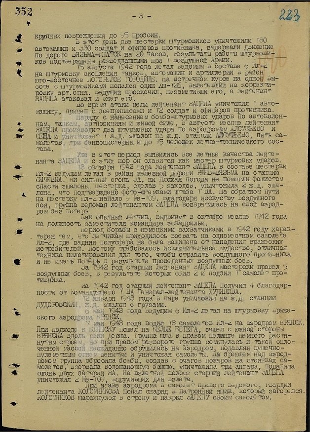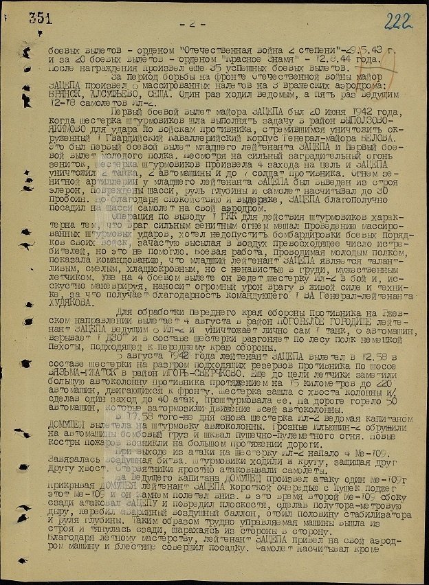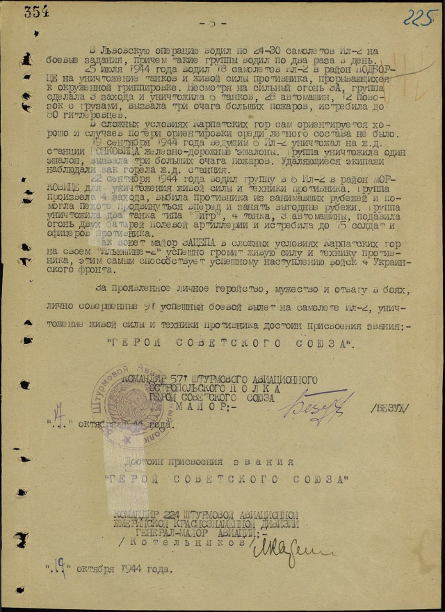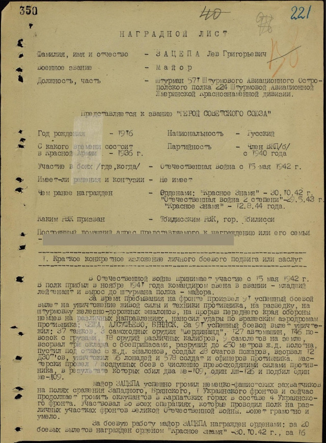 За станом на 17-те жовтня 1944 року вже майор Лев Зацепа здійснив 91 бойовий виліт, під час яких особисто знищив 37 ворожих танків, три самохідні штурмові гармати «Фердинанд», 127 автомобілів, 146 одиниць гужового транспорту, 18 гармат різних калібрів, дев’ять літаків на аеродромах і п’ять у повітрі, вісім залізничних ешелонів, 250 метрів залізничного полотна, 12 ДЗОТів, 56 коней та понад півтисячі гітлерівців. За ці подвиги Указом Президіума Верховної Ради СРСР від 23-го лютого 1945 майора Зацепу Льва Григоровича нагородили найвищою державною нагородою – званням Героя Радянського Союзу із врученням ордена Леніна і медалі «Золота Зірка» (медаль № 8802). Нижче подані унікальні скани нагородних документів з Центрального Архіву Міністерства Оборони в місті Подольськ Московської області, в яких вказано, що майору Зацепі присвоїли звання Героя Радянського Союзу.