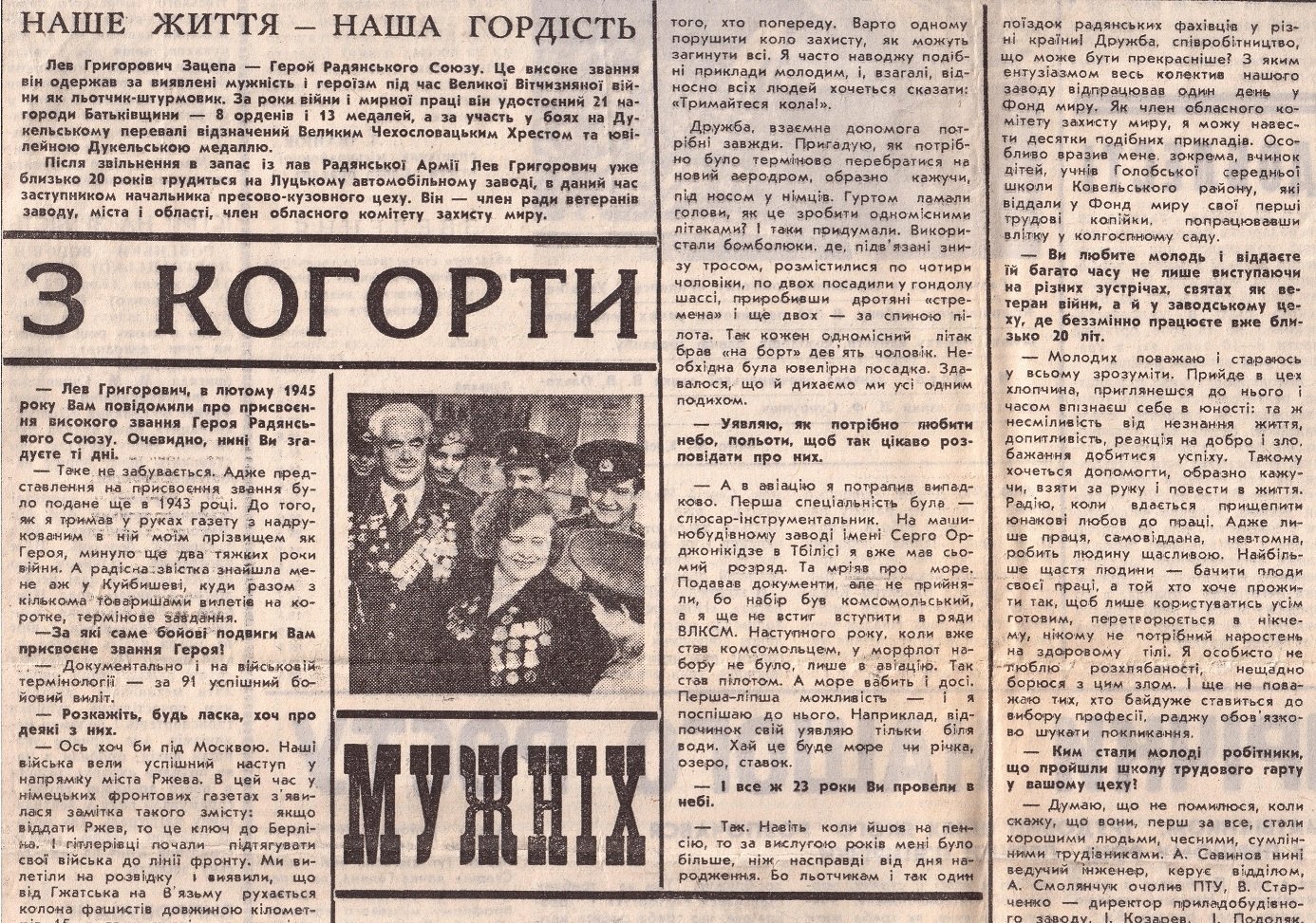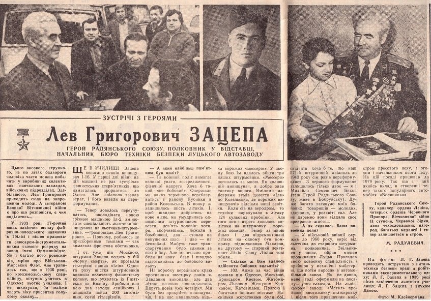 Лев Григорович Зацепа – Герой-українець, льотчик-штурмовик, Герой Радянського Союзу, почесний громадянин Луцька. По закінченню Другої Світової війни він проходив подальшу службу на Волині, а після звільнення в запас брав активну участь в організації виробництва на легендарному Луцькому автомобільному заводі «ЛуАЗ», на якому і пропрацював майже до самої смерті. Про чергового Героя, для якого Волинь стала другою рідною домівкою, а Волинська земля – місцем вічного спочивання, чергова публікація рубрики «Волинь не забуває».