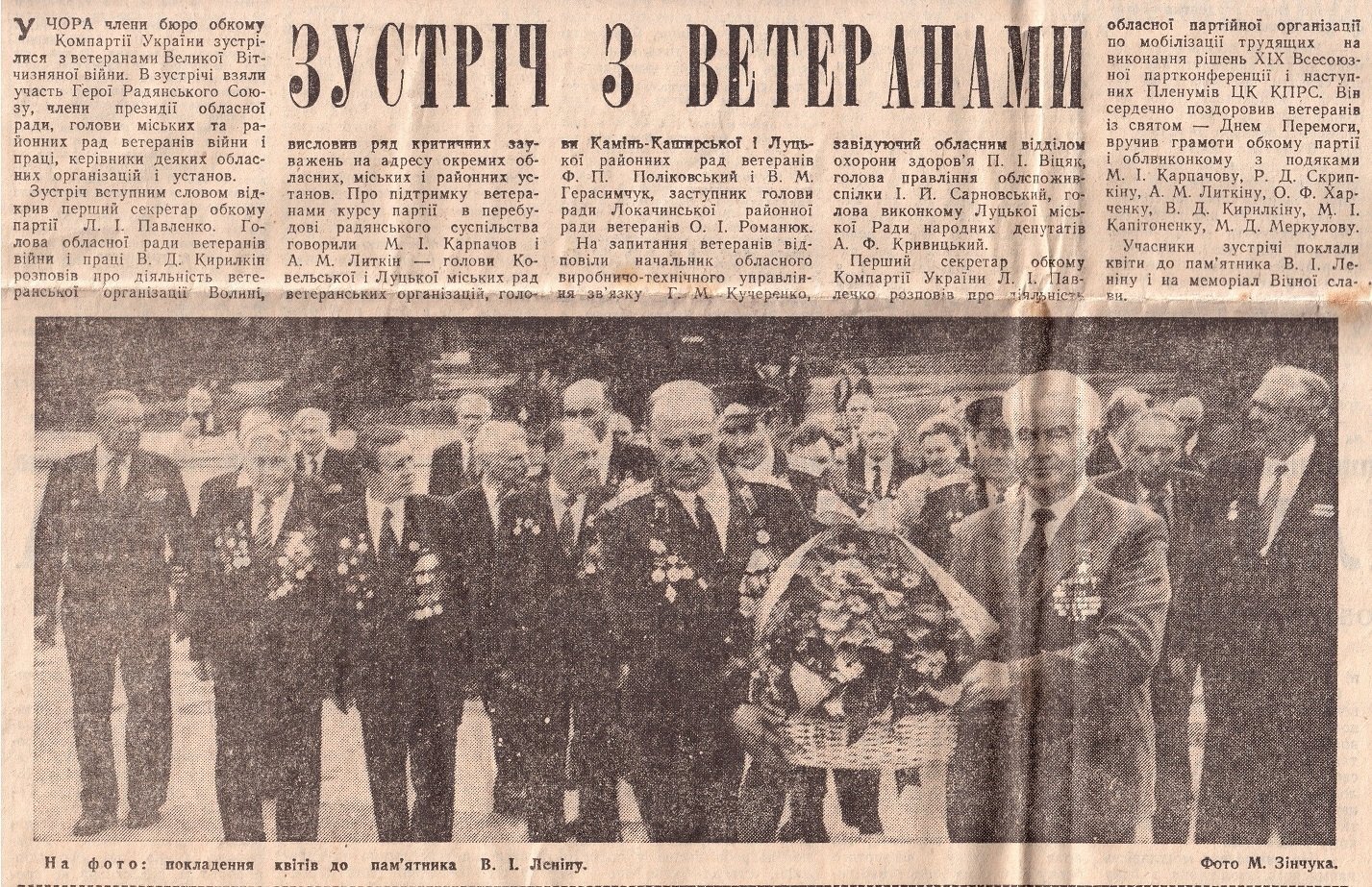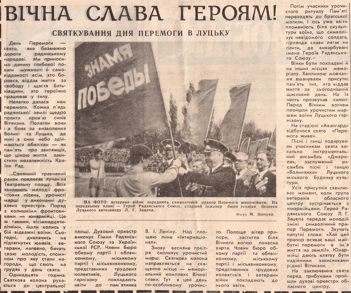 Газета «Радянська Волинь» від 6-го травня 1989 року. Зацепа (справа) покладає квіти до пам'ятника Леніну напроти будівлю Волинського Обкому ЦК КПРС (нині головний корпус Східноєвропейського Національного університету імені Лесі Українки)