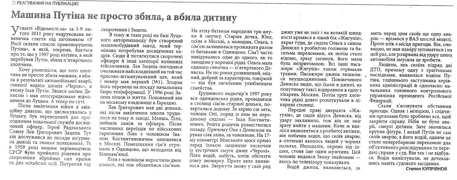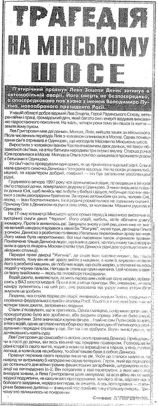 Трагічна доля сьомого онука Лілії Львівни, п’ятирічного правнука Героя Дениса, тісно пов’язана з нинішнім Президентом Росії Володимиром Путіним. У 1997 році родина поверталась з Москви до Одінцово. На 17-му кілометрі Мінського шосе в старенький «Жигулі» Лапшиних врізався джип «Черокі» Володимира Путіна, на той час заступника керівника Адміністрації та одночасно начальника головного контрольного управління тодішнього Президента Росії Бориса Єльцина. За кермом джипу був особистий водій Путіна, проте сам майбутній Президент РФ також знаходився в автівці, дідусь Дениса впізнав його, коли той вийшов з машини під час оформлення ДТП. Правнук Героя загинув на місці від отриманих під час зіткнення травм голови. Особистого водія Путіна, ясна річ, не покарали. Докладно цю трагедію описали в газетах «Відомості.UA» та «Волинь». Скани публікацій про цю трагедію у вищевказаних газетах подані нижче.
