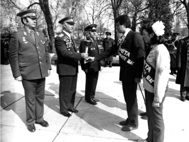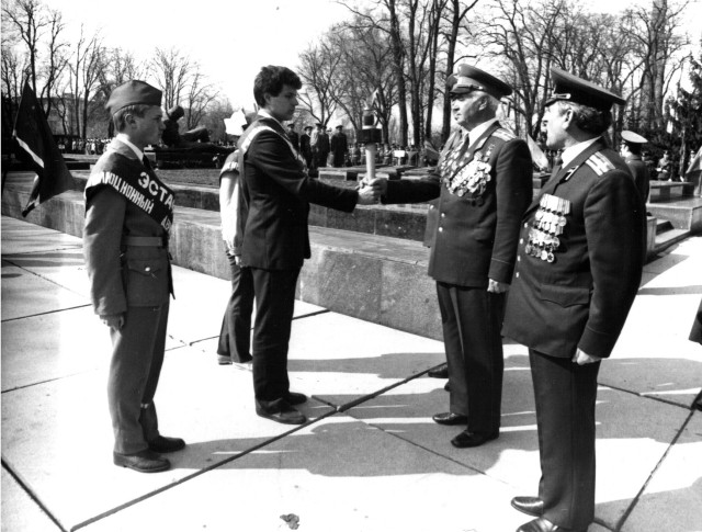 Почесний громадянин Луцька, Герой Радянського Союзу Лев Григорович Зацепа передає факел з Вічним Вогнем з Брестської фортеці Луцькій молоді