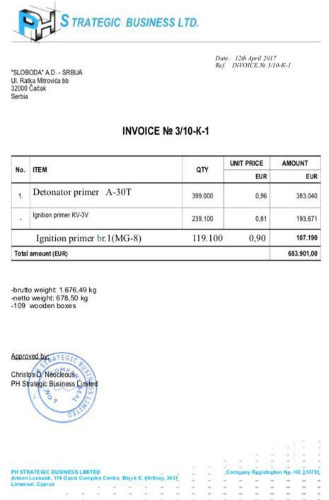 Отже, в квітні минулого року «Імпульс» продав партію в кількості 109 упаковок капсуль-детонаторів та капсуль-запалювачів за 95 тисяч євро. Покупцем виступив кіпрський офшор PH Strategic Business Limited. Одержувачем продукції була сербська компанія Sloboda.