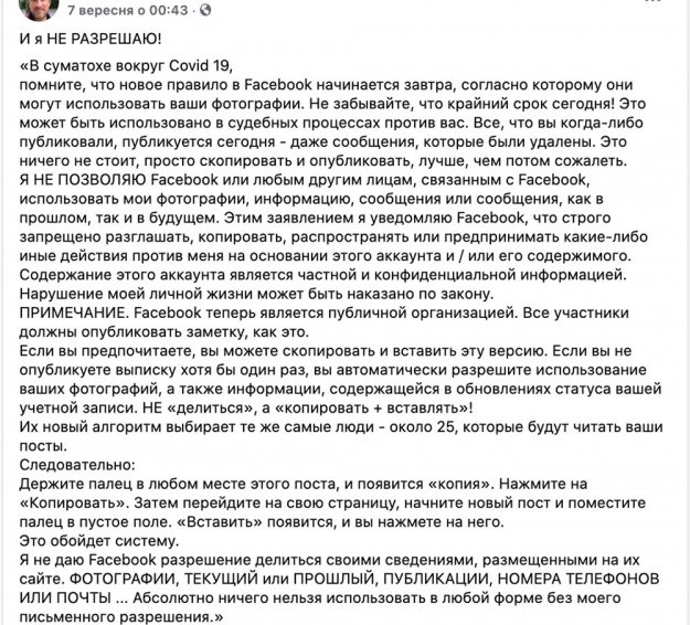 Чи просто скопіювати текст допису, адже саме він забороняє Цукербергу використовувати наші дані (фото, тексти тощо).