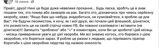 Великою популярністю користуються флешмоби про допомогу. Популяризація теми онкології, допомога малому бізнесу чи навіть самому Facebook.