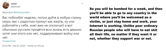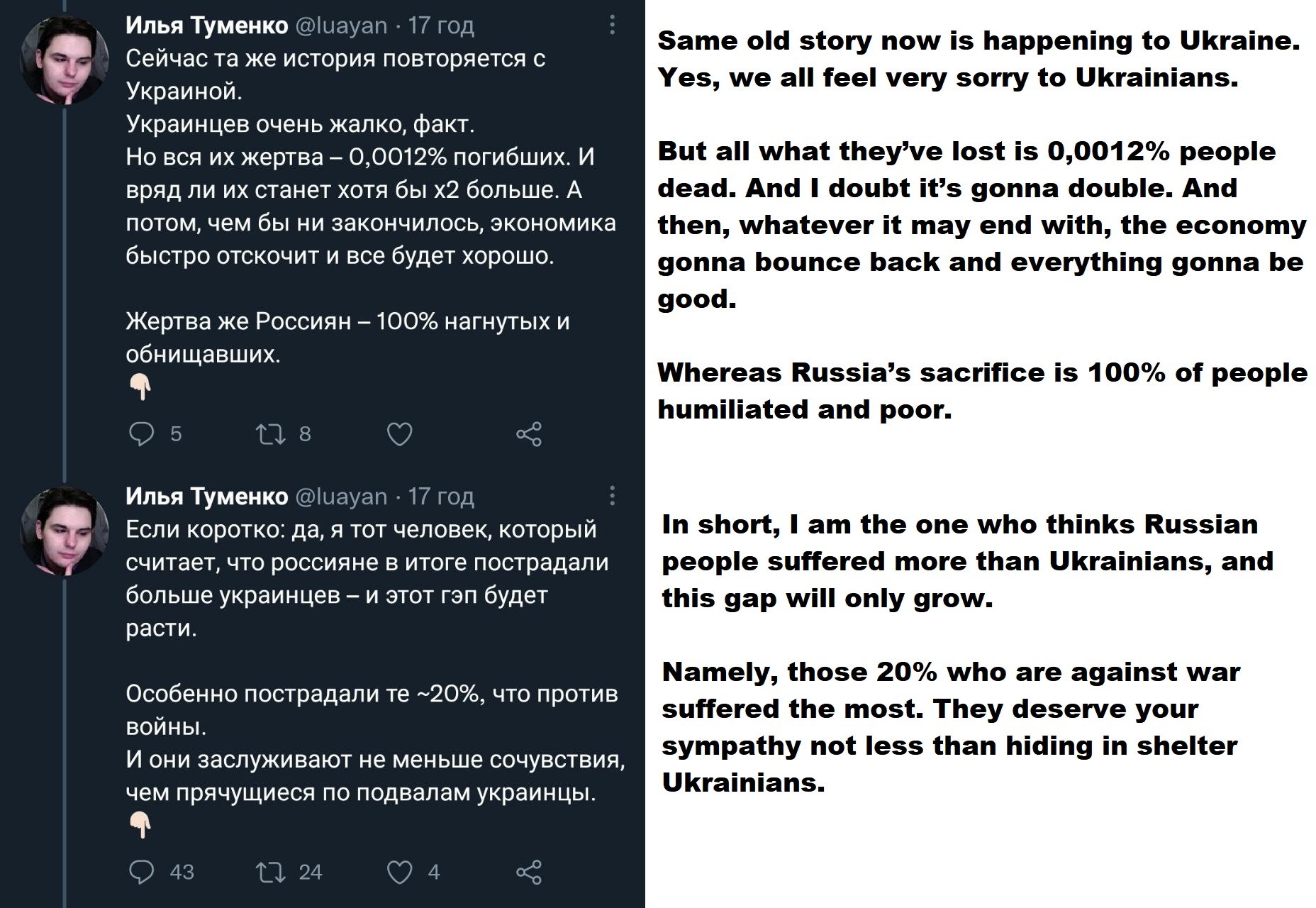 «Маленькі люди». «Нічого не вирішуємо». Типовий «синдром жертви». Плюс Закон Годвіна: тільки замість Гітлера чи Голокосту росіяни, вичерпавши всі аргументи, починають скаржитися на... геноцид росіян. Знаєте, в чому він полягає? В тому, що відключили Spotify і не дали можливості купити акулу в IKEA.