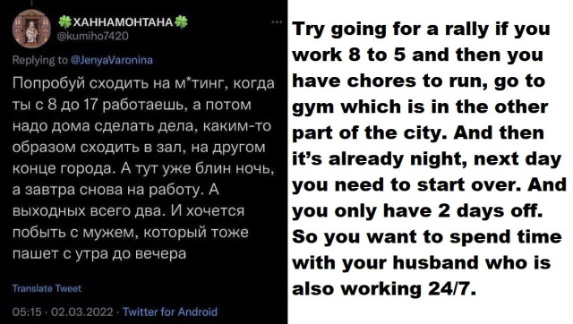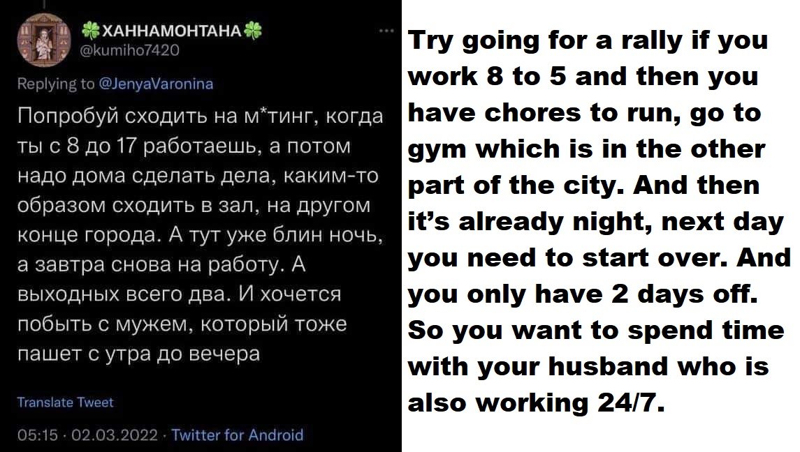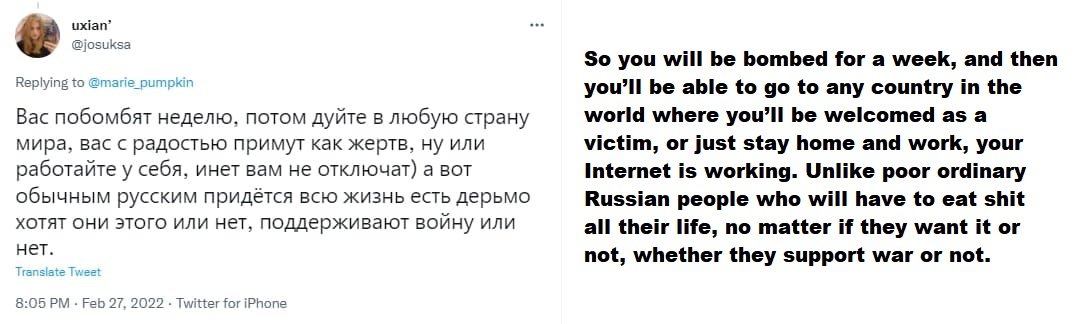 Класичний приклад. Інфлюенсери в Росії не закликали людей виходити на вулиці через закриття Instagram, а скаржилися, що у них забирають майбутнє та «їхні домівки». Мабуть, в українців із майбутнім та домівками зараз усе гаразд.