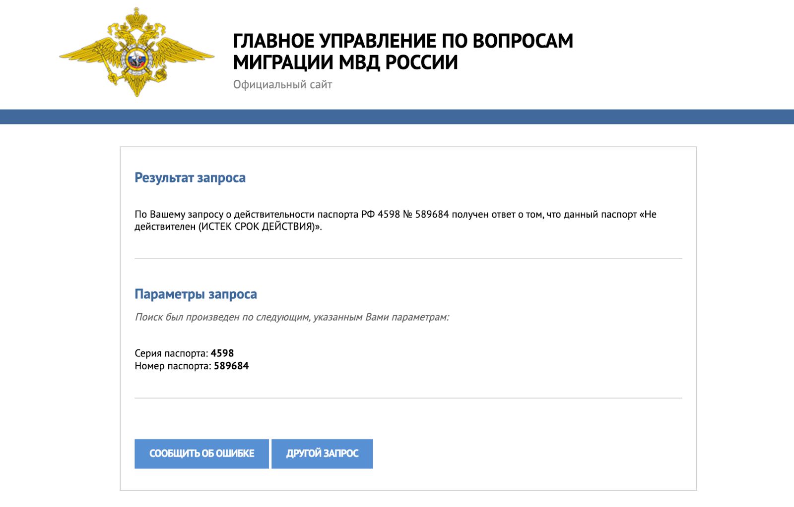 Але, на диво, щодо цього паспорту МВС росії http://сервисы.гувм.мвд.ру) видає інформацію про те, що він колись існував, але строк його дії закінчився: