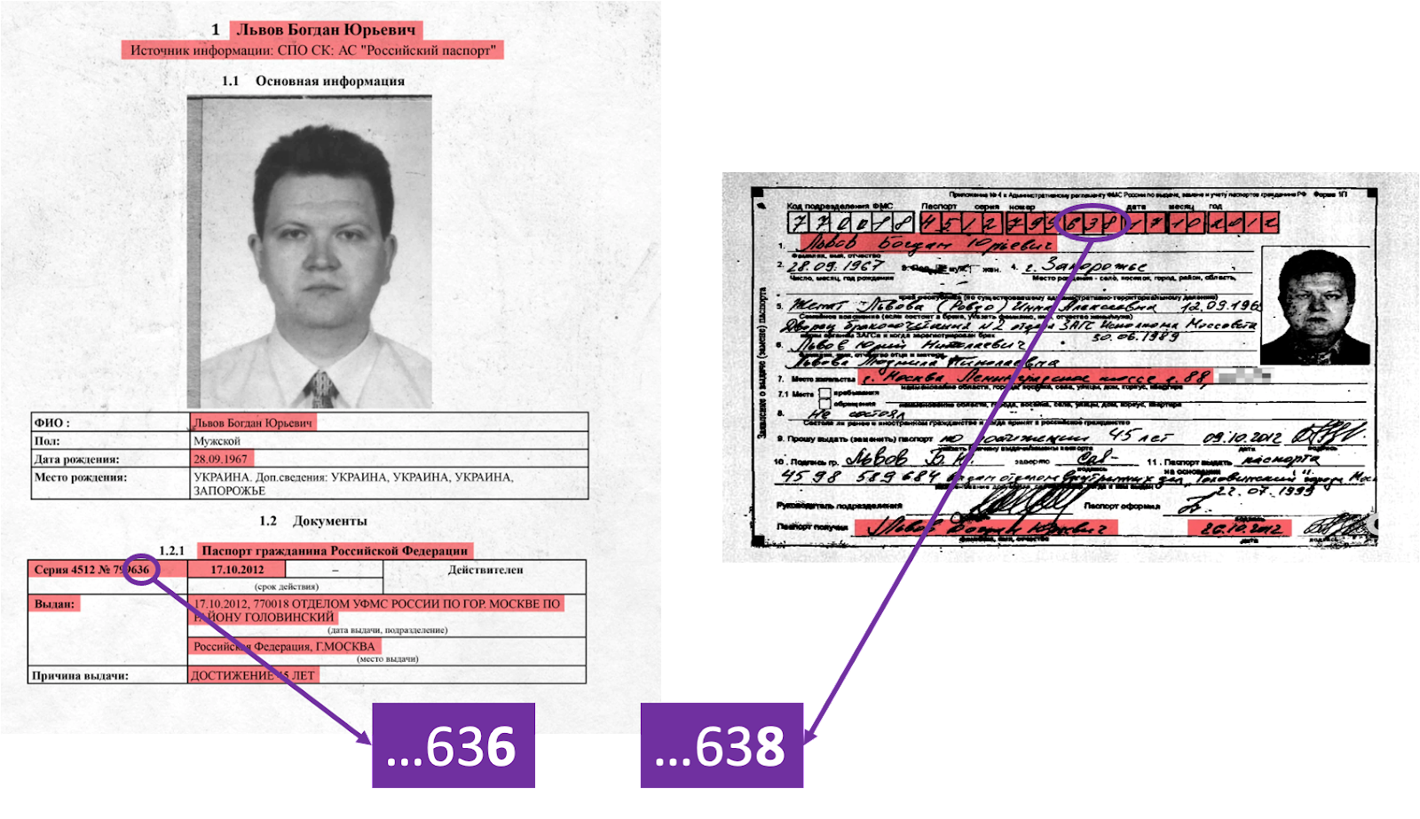Здається, паспорт серії 4512 799636 дійсно належить особі з іменем «Львов Богдан Юрьевич” і датою народження. Бо якби якийсь із вказаних чотирьох факторів не співпав з іншими факторами, я отримував би відповідь «Інформація не знайдена”. Я не роблю скріншоти, але я по черзі змінив по одній літері і цифрі у кожному факторі і кожного разу отримував на виході І«нформація не знайдена”. І це рівно те, що опублікували журналісти Схем.