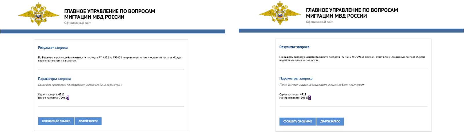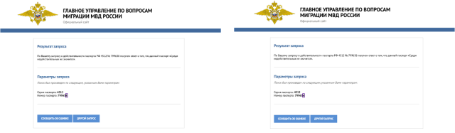 Отже, моя гіпотеза знов була така, що це або технічна помилка, або несправжній документ.Пошук обох паспортів у системі МВС росії не допоміг, бо за даними системи обидва паспорти не є недійсними: