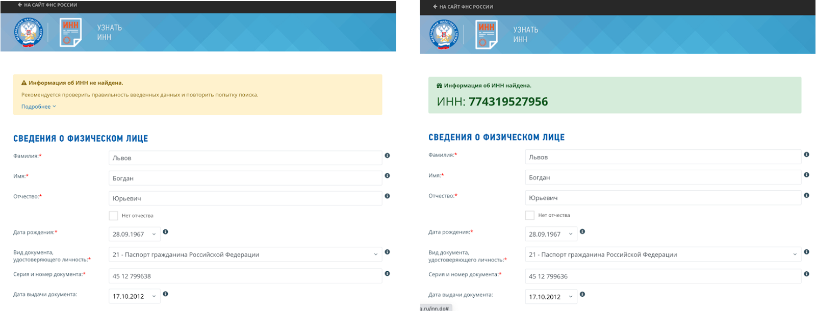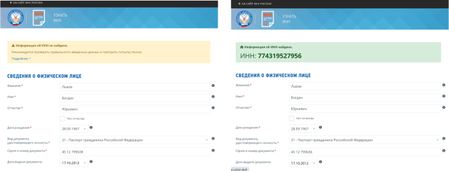 На допомогу прийшла інша база даних – база податкових номерів (https://service.nalog.ru/inn.do). Ця база дозволяє дізнатися податковий номер громадянина росії за умови, якщо відомі чотири фактори:номер паспорту, дата видачі паспорту, ПІБ особи, і дата народження особи.
