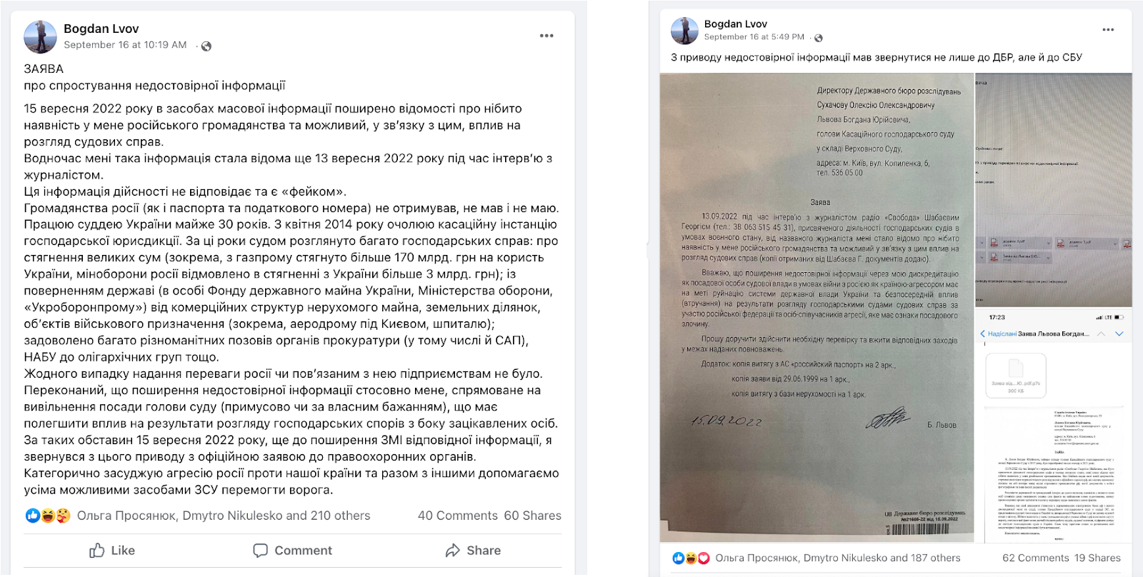 16 вересня Богдан Львов опублікував у себе на сторінці у ФБ спростування, у якому заявив, що опублікована інформація «...дійсності не відповідає та є фейком». Пізніше того ж дня суддя опублікував скани листів до ДБР і СБУ з приводу недостовірності опублікованої журналістами інформації: