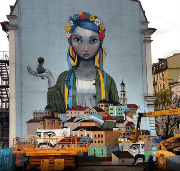 Так, учасники проекту "Стінаrt" на розі Андріївського узвозу та вул. Боричів Тік намалювали 15-метрове графіті, на якому зображена українка з дитиною на руках.