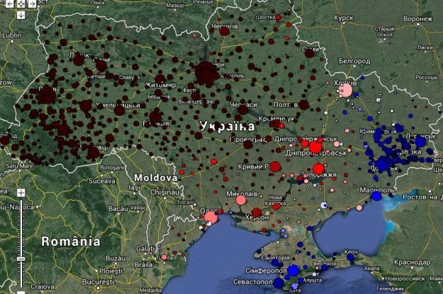 На карті показане відношення між кількістю підписників сторінок Євромайдану та Антимайдану вКонтакті за населеними пунктами. Видно, що Захід та Центр підтримує майдан цілковито, а на "Середньому Сході" – від Харкова до Одеси – підтримка помірна. Лише в трьох регіонах підтримка Антимайдану переважала – у Криму, Донецьку та Луганську.