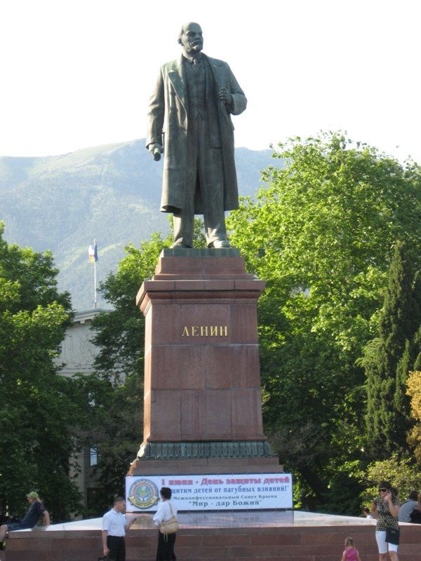 На набережній Ялти нас зустрів Ленін і плакат до Дня захисту дітей, який місцеві активісти Міжконфесійної ради Криму, чомусь розміщають саме біля підніжжя символа атеїзму, негуманності і насильства.