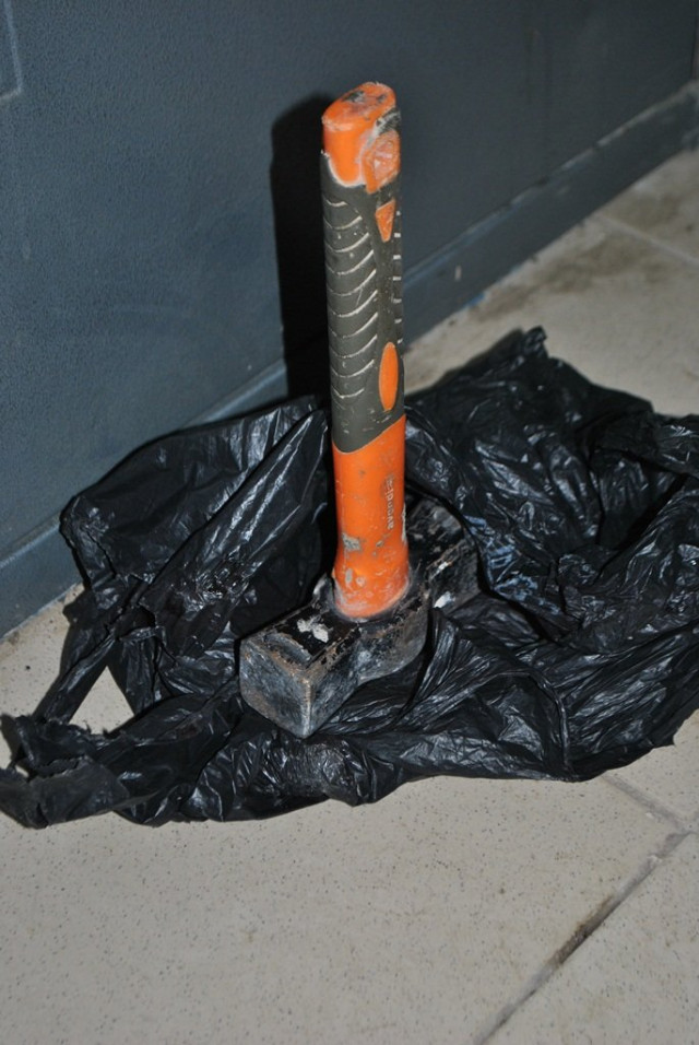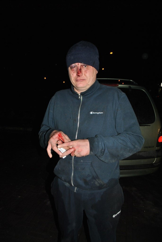 11.01.2015 о 01.15 за направленням із чергової частини у під’їзді по вул. Кравчука на майданчику між першим та другим поверхами виявляємо двох чоловіків із трішки розбитими обличчями (світлини додаю). Першого так розмалювали відпочивальники пивбару «Допінг», де й він перебував, другого – той перший, тільки за те, що другий поночі ходить з молотком у пакеті. Виявляється (зі слів першого потерпілого-нападника), що той другий, нападник-потерпілий, таки бив його молотком. Він, мабуть, до кінця не оцінив ситуацію, як це молотком «получити» і що б із ним сталося в результаті такого побиття. Маємо сподівання, що слідчі-правоохоронці міськвідділу «розберуться» в даній події. Зі слів оперативників відомо лише те, що той, що з молотком прогулювався (ну не з сокирою ж ходити), вирішив пройтися по «злачних» місцях з надією власні речі відшукати, бо його вдень пограбували. Невідомо, чи речі знайшов, а от синців назбирав. Двічі на день чоловіку «поперло».