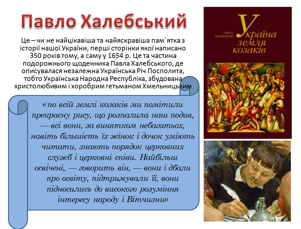Павло Халебський позитивно трактує входження українських земель до складу Московської держави (пізніше це саме бачимо в козацьких літописців). «Як татари неситі відділилися від Хмеля, – читаємо в Щоденнику, – гетьман знову бив чолом цареві московському, аби той прийняв під свою руку. Справу нарешті було залагоджено за сприянням патріарха (мається на увазі єрусалимський патріарх Паїсій, який певний час перебував при Богдані Хмельницькому – П. К.) та завдяки прихильности московітів до православної віри. Цар обдарував Хмеля та всіх його вельмож царськими каптанами й зробив його князем за вагою його держави. Потім він одіслав двох воєвод із шістдесятьма тисячами війська до міста Києва. Вони збудували довкола нього укріплення й міцно утвердилися у фортеці, щоб відбивати напади ляхів на козаків. Цар записав на службу сорок тисяч козаків зі щорічною платнею від скарбниці, приєднавши їх до свого війська» (Там само. – С. 47). Позитивно говорить Павло Халебський й про те, що в православних церквах України моляться й згадують московського царя Олексія (Там само. – С. 30).