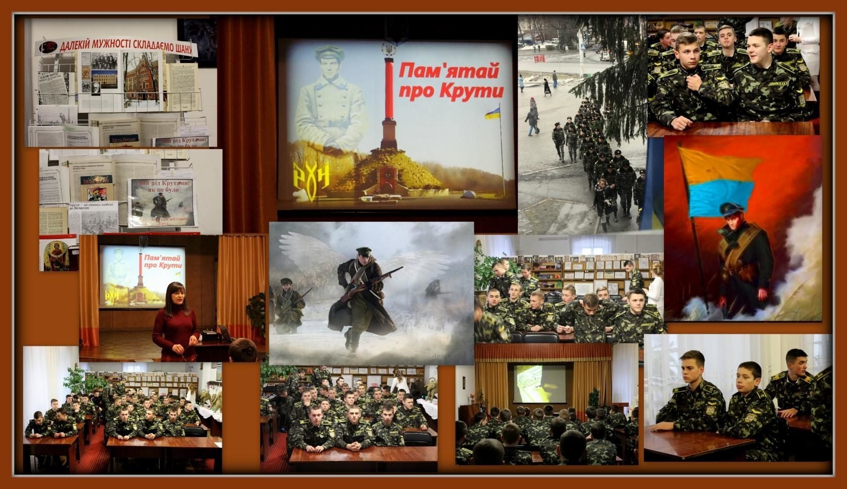 Тому й організували ми сьогодні коментований мультимедійний показ «Крути: і сум, і біль, і вічна слава», який включив кадри документальної хроніки, світлини тих часів, роздуми та коментарі істориків, патріотичні відеокліпи. Адже, навіть коли відкинути увесь романтичний флер, виявляється, що бій цей мав велике стратегічне та політичне значення, і, якби не більш, аніж тижнева зупинка більшовиків на станції Крути, якби ввійшли вони у Київ раніше, коліщатка історії прокрутились, скоріш всього, в іншому напрямку.