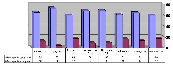 Найбільш дисциплінованими виявилися представники НСНУ - депутати Карпук В.Г, Мартиненко М.В. та КПУ - Мартинюк А.І. адже в них найменша кількість позначок про відсутність під час реєстрації у Верховній раді.