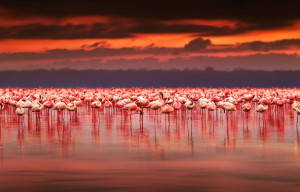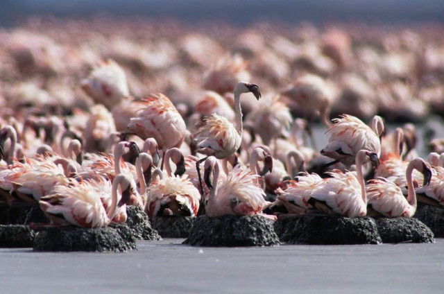 Води озера надійно захищають фламінго від хижаків під час шлюбного періоду, тому мільйони цих птахів прилітають сюди гніздитися, проте це все ж таки досить небезпечно - фламінго будують свої гнізда на острівцях солі, які оточують смертельні води озера.