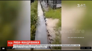 У Китайській провінції Гуандун зняли рідкісні кадри, як сотні риб виповзли із води та пересуваються по землі в пошуках чистішої водойми.