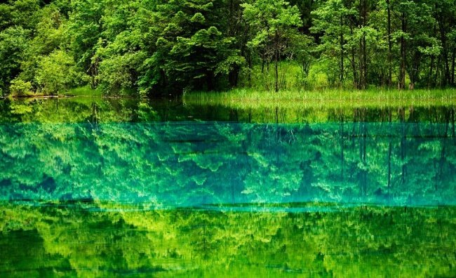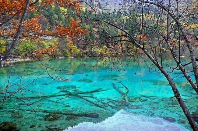 Небо і земля відображаються в озері П’яти Кольорів, вигадливо пофарбованому мінеральними солями і водяними рослинами. Його колір змінюється час від часу, від жовтого до темно зеленого, але більшу частину часу вода тут алмазно-синього кольору. На відміну від безлічі сусідніх озер, воно не мілкішає і не замерзає взимку. Тому це місце оповите таємницями і загадками. Китайці вважають його чарівним.