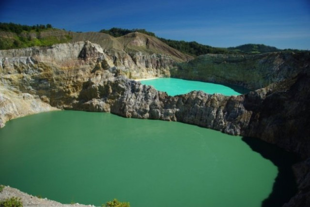 У кратерах вулкана Келімуту на острові Флорес в Індонезії розташовується три кратерних озера. Ці озера не тільки мають різні кольори, але ще і можуть їх змінювати. Наприклад, чорне озеро може стати червоним, потім бірюзовим, потім зеленим. Колір озер залежить від переважаючих мінеральних речовин, розчинених у їхніх водах. У місцевих племен ліо існує легенда, згідно з якою в озерах мешкають душі померлих. У червоному озері живуть душі вбивць і грішників, праведники і люди похилого віку – в бірюзовому, а молодь – в зеленому.