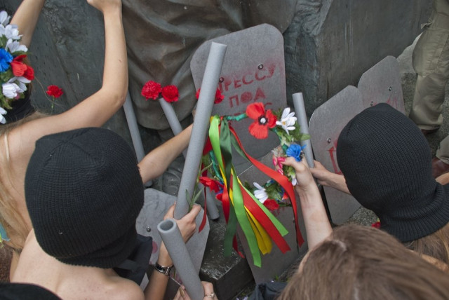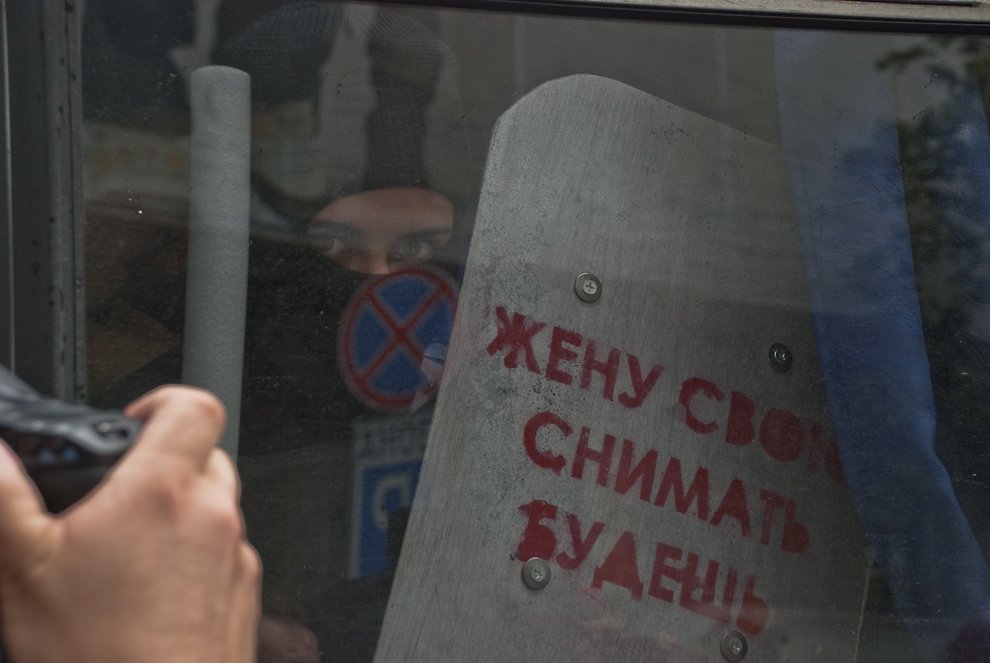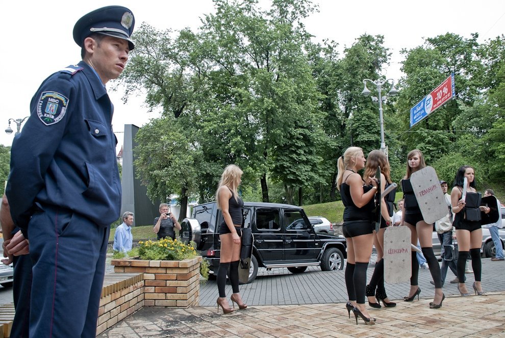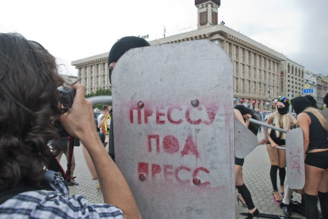 Активістки FEMEN в костюмах спецназу в «придушували свободу слова» пройшлись «гумовими палицями» по журналістах, які пришли знімати акцію.