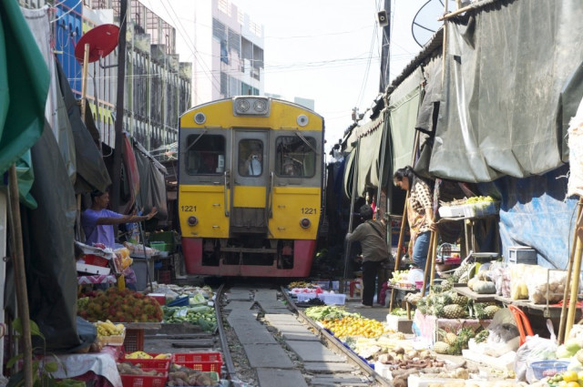 На перший погляд ринок Меклонг схожий на сотні інших тайських ринків. Але тільки доти, поки не пролунає гудок потяга, шлях якого проходить прямісінько через торговельні ряди. Буквально за секунди торговці прибирають свій товар і складають навіси, пропускаючи поїзд, що рухається зі швидкістю близько 15 км/год.